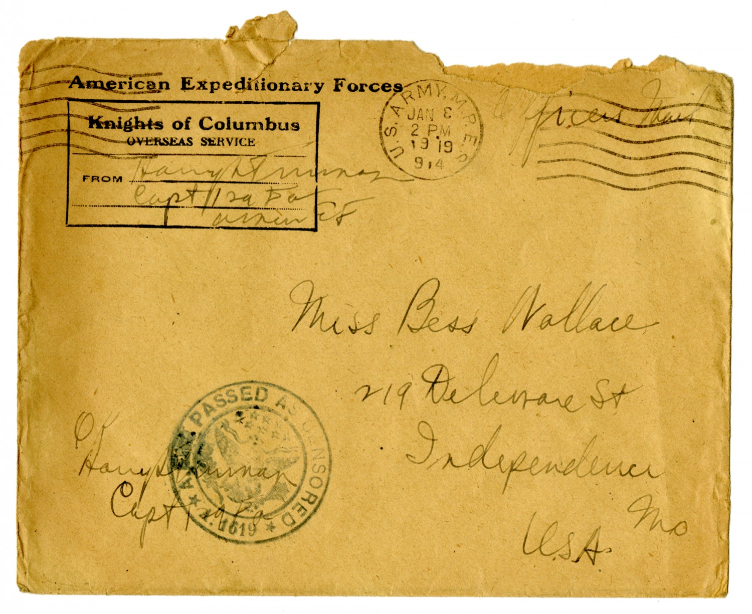 American Expeditionary Forces [stamp] Knights of Columbus Overseas Service From Harry S Truman Capt 129 FA Amer E F [stamp] U.S. Army, M.P.E.S. [January] 2PM 1919 Miss Bess Wallace 219 Delaware [Missouri] U.S.A. OK Harry S Truman Capt 129 FA [stamp] Passed as Censored A. 1619