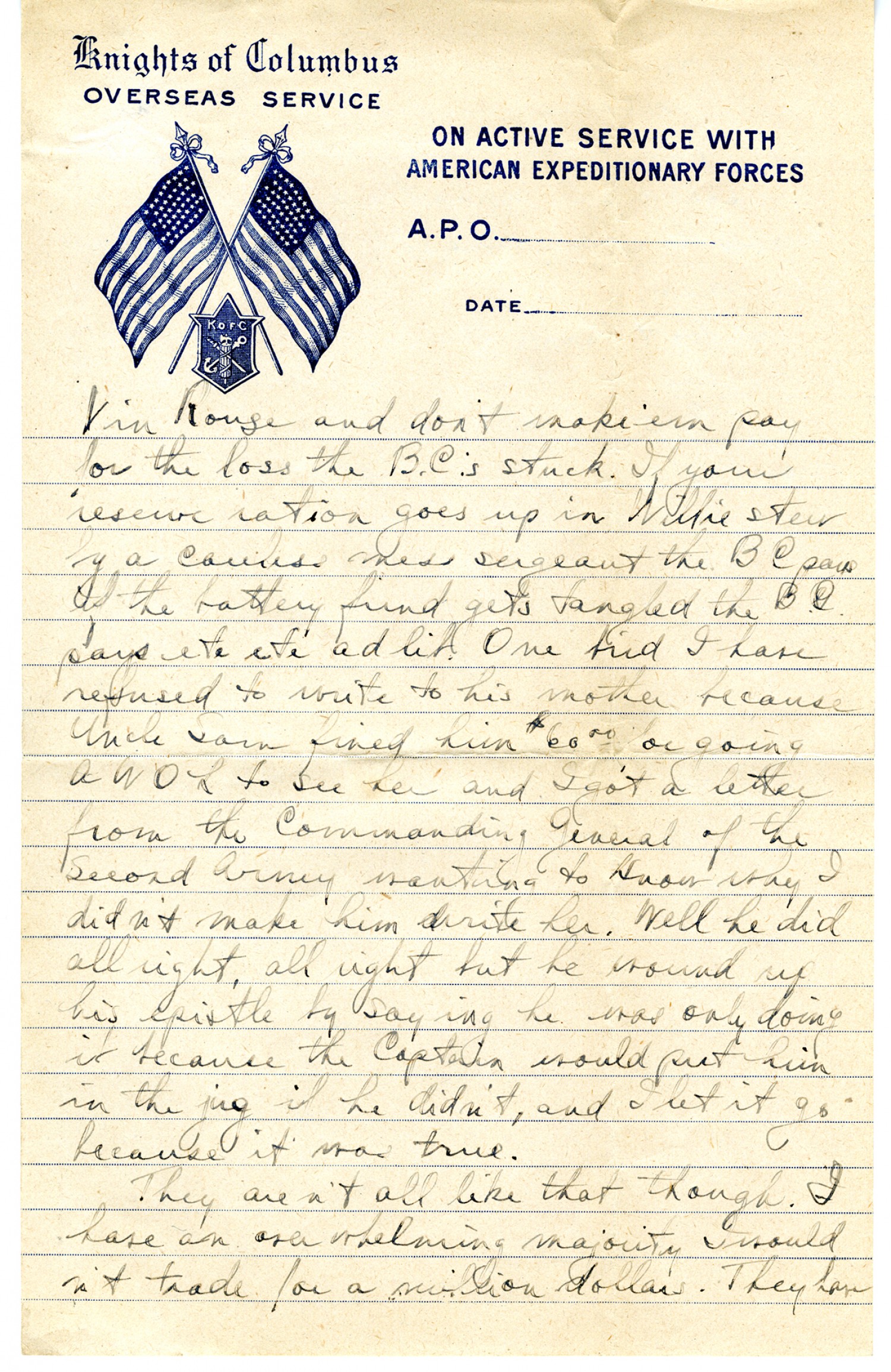 Knights of Columbus letterhead] Vin Rouge and don't make 'em pay for the loss the B. C.'s stuck. If your reserve ration goes up in Willie Stew by a careless mess sergeant the B C pays. If the battery fund gets tangled the B. C. pays etc etc ad lib. One bird I have refused to write to his mother because Uncle Sam fined him $60.00 for going A W O L to see her and I got a letter from the Commanding General of the Second Army wanting to know why I didn't make him write her. Well he did all right, all right but he wound up his epistle by saying he was only doing it because the Captain would put him in the jug if he didn't, and I let it go because it was true. They aren't all like that though. I have an overwhelming majority I wouldn't trade for a million dollars.