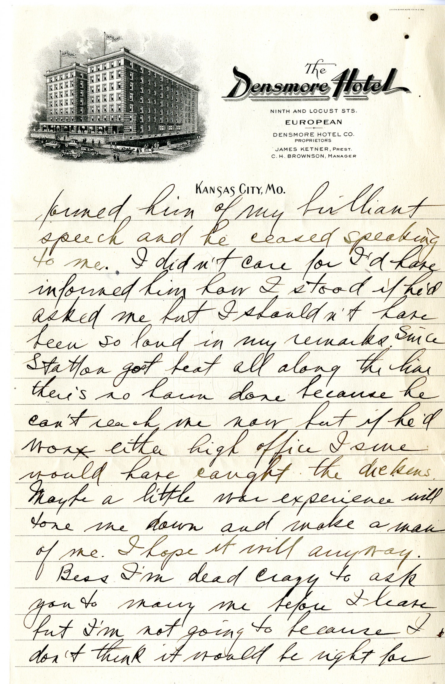 [Densmore Hotel Kansas City letterhead], [Missouri] July 14, 1917 11 P.M., Saturday night Dear Bess: I have just finished the Regimental Banquet. It was a very solemn affair. Colonel Klemm made us a speech on our duties to God and country, and Lieutenant Colonel Elliott made one on the duties of an artillery officer. They were both from the shoulder and gave us something to think about. I had thought somewhat on both subjects, but not as far as these gentlemen went. According to them, we have placed ourselves on a position of placing the American Government above everything, even our lives. We are expected to do absolutely as we