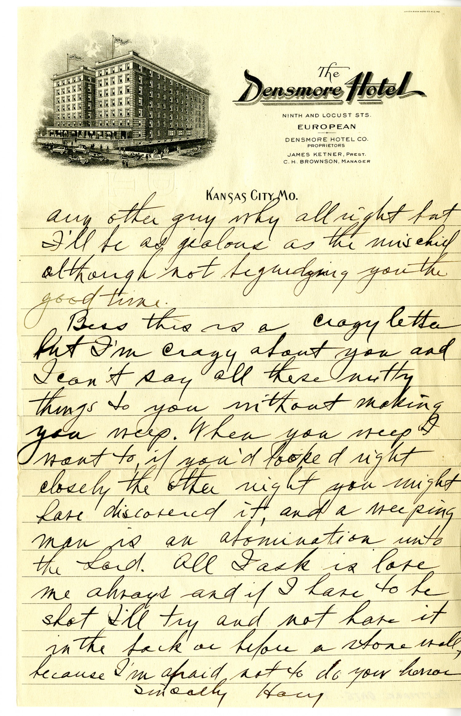 any other guy why all right but I'll be as jealous as the mischief although not begrudging you the good time. Bess this is a crazy letter but I'm crazy about you and I can't say all those nutty things to you without making you weep. When you weep I want to. If you'd looked right closely the other night you might have discovered it, and a weeping man is an abomination unto the Lord. All I ask is love me always and if I have to be shot I'll try and not have it in the back or before a stone wall, because I'm afraid not to do you honor. Sincerely Harry