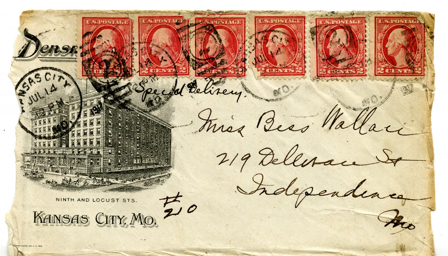 [Envelope]Special Delivery Miss Bess Wallace 219 Delaware St. Independence, [Missouri]#210 [stamp] KANSAS CITY JUL 14 12 PM [Missouri]