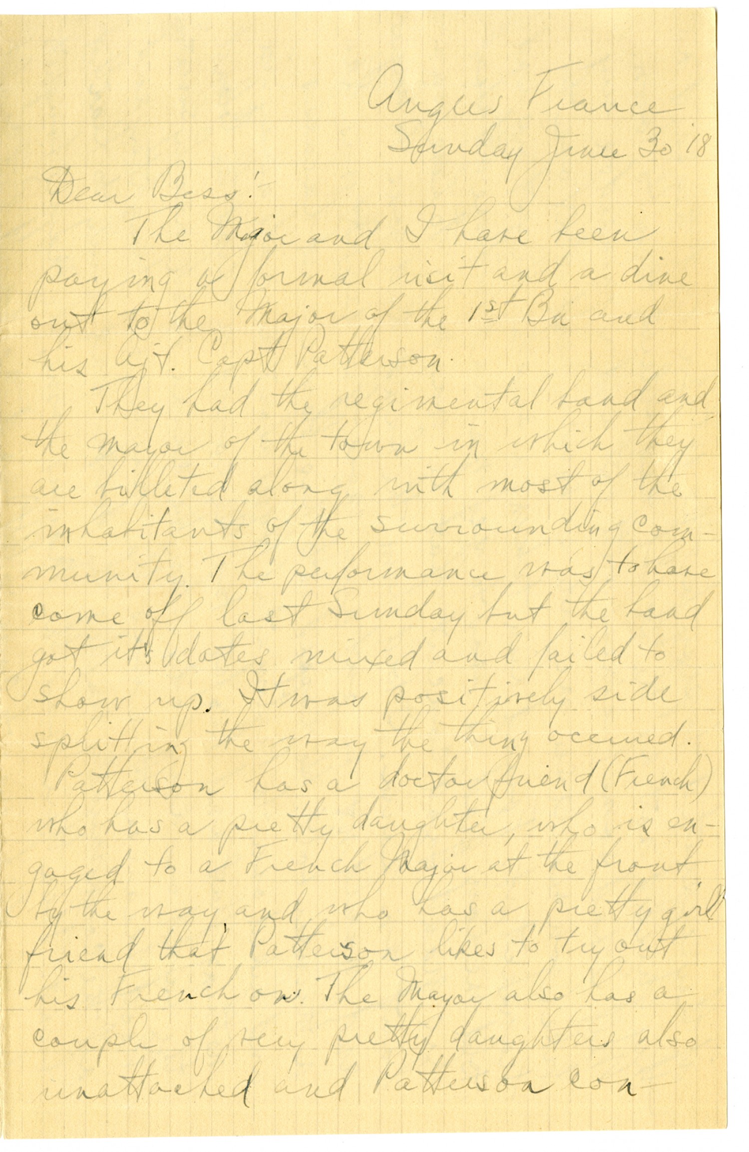 Angers France Sunday June 30 [1918] Dear Bess: The Major and I have been paying a formal visit and a dine out to the Major of the 1st Bn and his Adj Capt Patterson. They had the regimental band and the mayor of the town in which they are billeted along with most of the inhabitants of the surrounding community. The performance was to have come off last Sunday but the band got its dates mixed up and failed to show up. It was positively side splitting the way the thing occurred. Paterson has a doctor friend (French) who has a pretty daughter, who is engaged to a French Major at the front, by the way, and who has a pretty girlfriend that Paterson likes to try out his French on. The Mayor also has a couple of very pretty daughters also unattached and Paterson con-