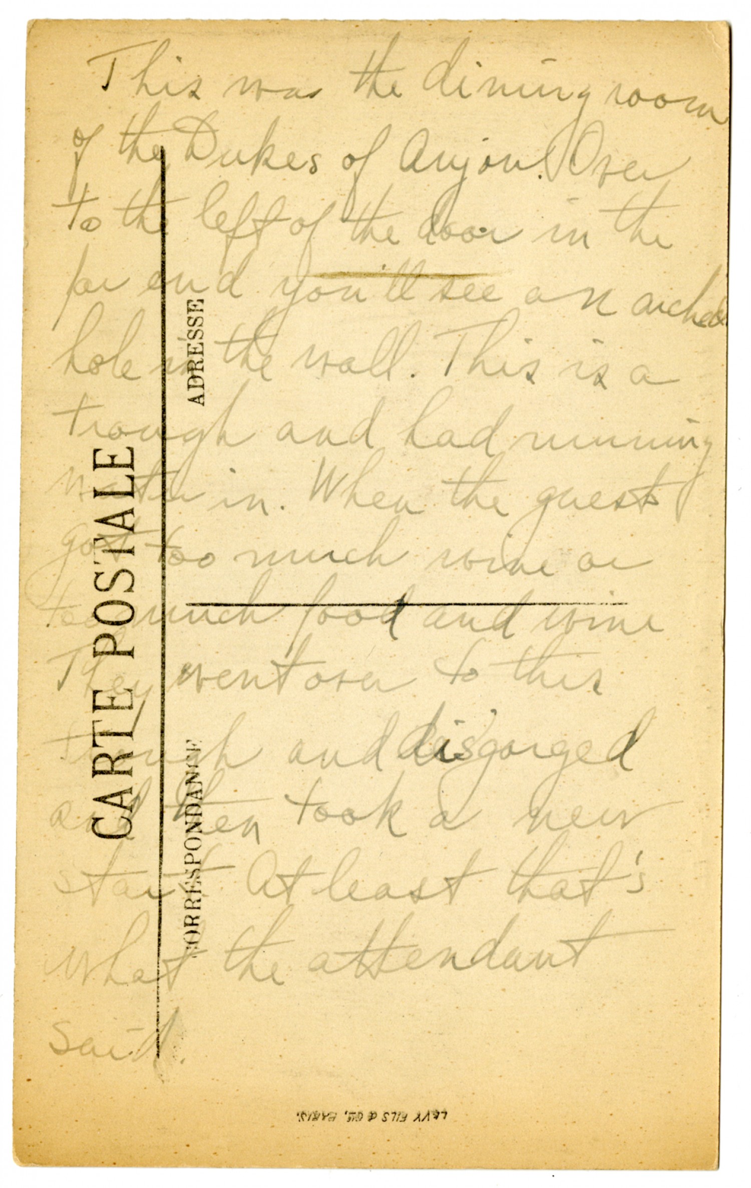 This was the dining room of the Dukes of Anjou. Over to the left of the door in the far end you'll see an arched hole in the wall. This is a trough and had running water in. When the guests got too much wine or too much food and wine they went over to this trough and disgorged and then took a new start. At least that's what the attendant said.