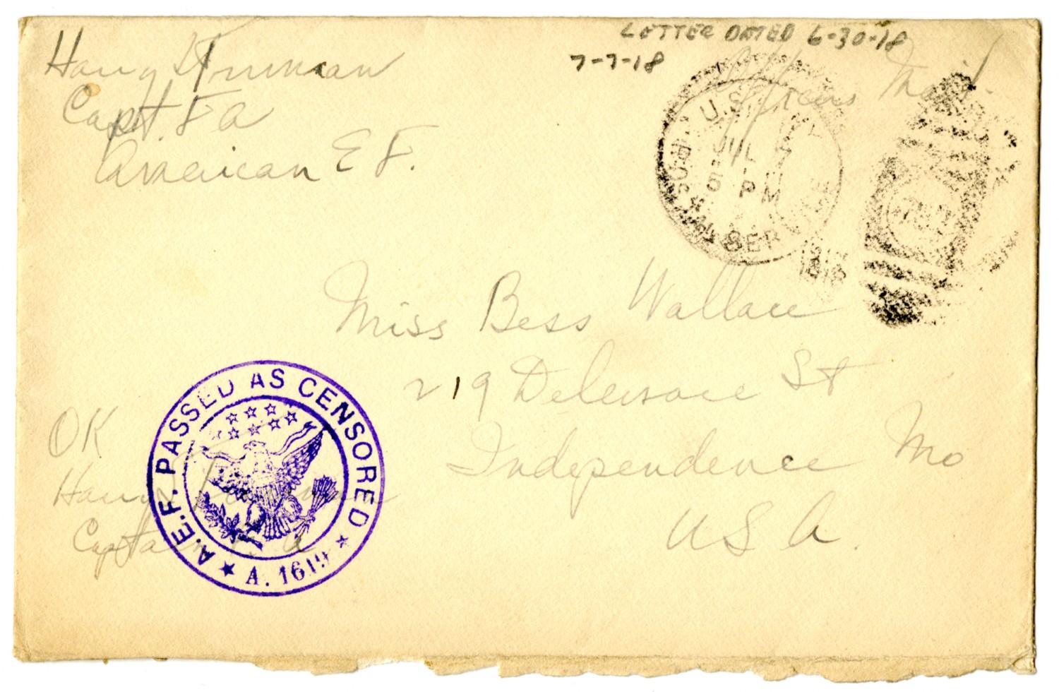 Harry Truman Captain F.A. American E.F. LETTER DATED 6-30-[1918] 7-7-[1918] Officers Mail [ms illegible: 2 stamps] Miss Bess Wallace 219 Delaware St Independence [Missouri] U.S.A. OK Harry S. Truman Captain F.A. LTR DATED 6-27-[1918] [STAMP] A.E.F. PASSED AS CENSORED A.161