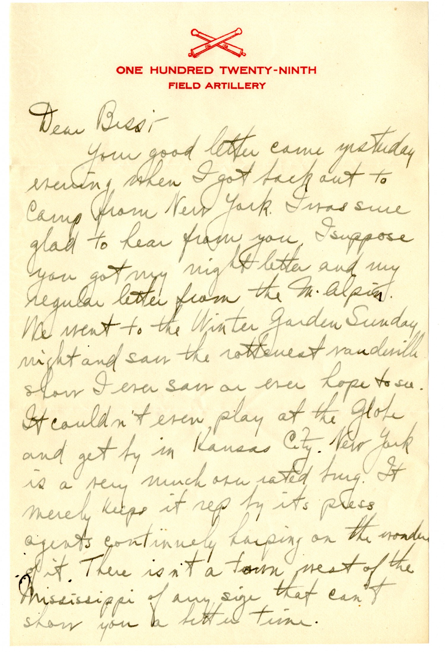 [ONE HUNDRED TWENTY-NINTH FIELD ARTILLERY letterhead]Dear Bess: Your good letter came yesterday evening when I got back out to camp from New York. I was sure glad to hear from you. I suppose you got my night letter and my regular letter from the McAlpin. We went to the Winter Garden Sunday night and saw the rottenest vaudeville show I ever saw or ever hope to see. It couldn't even play at the Globe and get by in Kansas City. New York is a very much overrated burg. It merely keeps its rep by its press agents continually harping on the wonder of it. There isn't a town west of the Mississippi of any size that can't show you a better time.