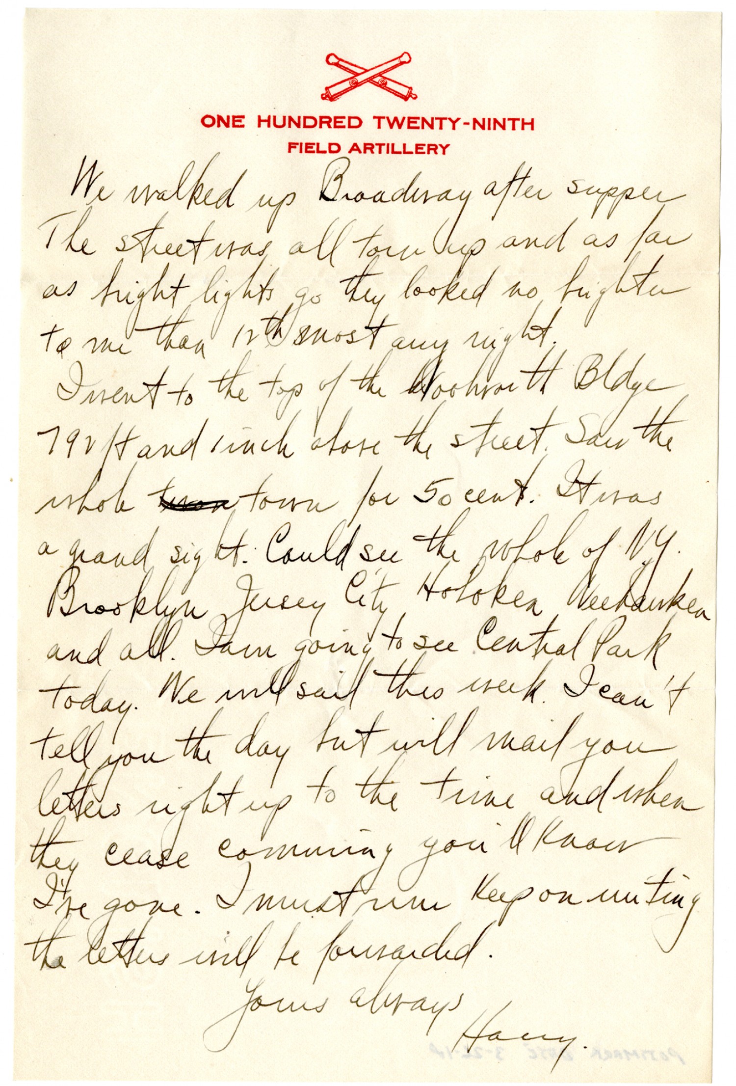 [ONE HUNDRED TWENTY-NINTH FIELD ARTILLERY letterhead]We walked up Broadway after supper. The street was all torn up and as far as bright lights go they looked no brighter to me than 12th most any night. I went to the top of the Woolworth Building 792 feet and 1 inch above the street. Saw the whole town for fifty cents. It was a grand sight. Could see the whole of N.Y. Brooklyn Jersey City Hoboken Weehawken and all. I am going to see Central Park today. We will sail this week. I can't tell you the day but will mail you letters right up to the time and when they cease coming you'll know I've gone. I must run. Keep on writing the letters will be forwarded. Yours always Harry
