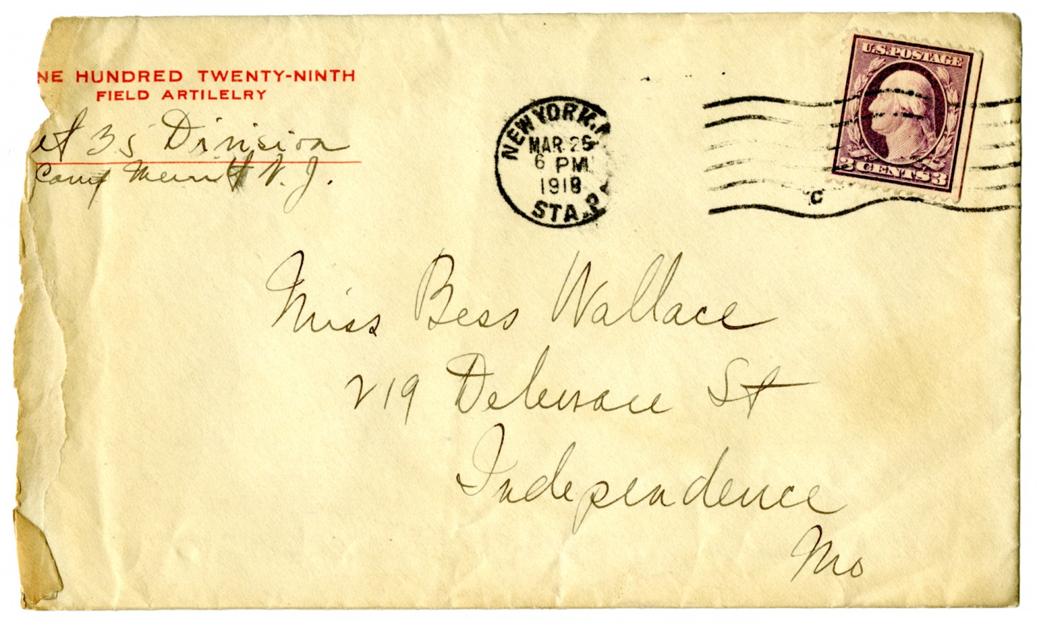 [ms illegible: torn 1 word] HUNDRED TWENTY-NINTH FIELD ARTILELRY S.T. Def 35th Division Camp Merritt N.J. Miss Bess Wallace 219 Delaware St Independence [Missouri]