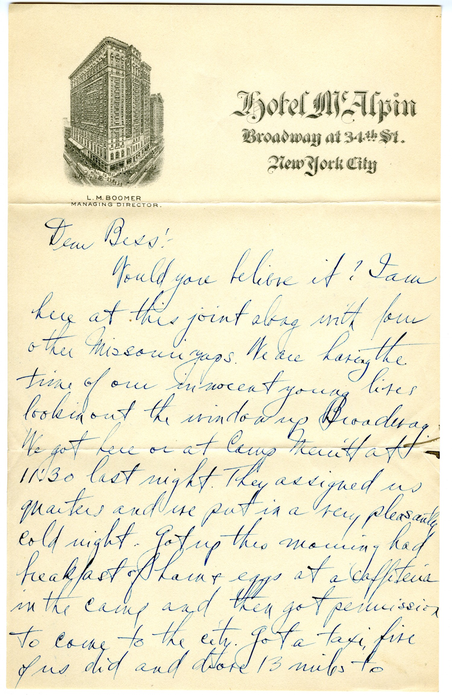 Dear Bess: Would you believe it? I am here at this joint along with four other Missouri guys. We are having the time of our innocent young lives lookin out the window up Broadway. We got here at Camp Merritt at eleven-thirty last night. They assigned us quarters and we put in a very pleasantly cold night. Got up this morning had breakfast of ham & eggs at a cafeteria in the camp and then got permission to come to the city. Got a taxi, five of us did, and drove 13 miles to