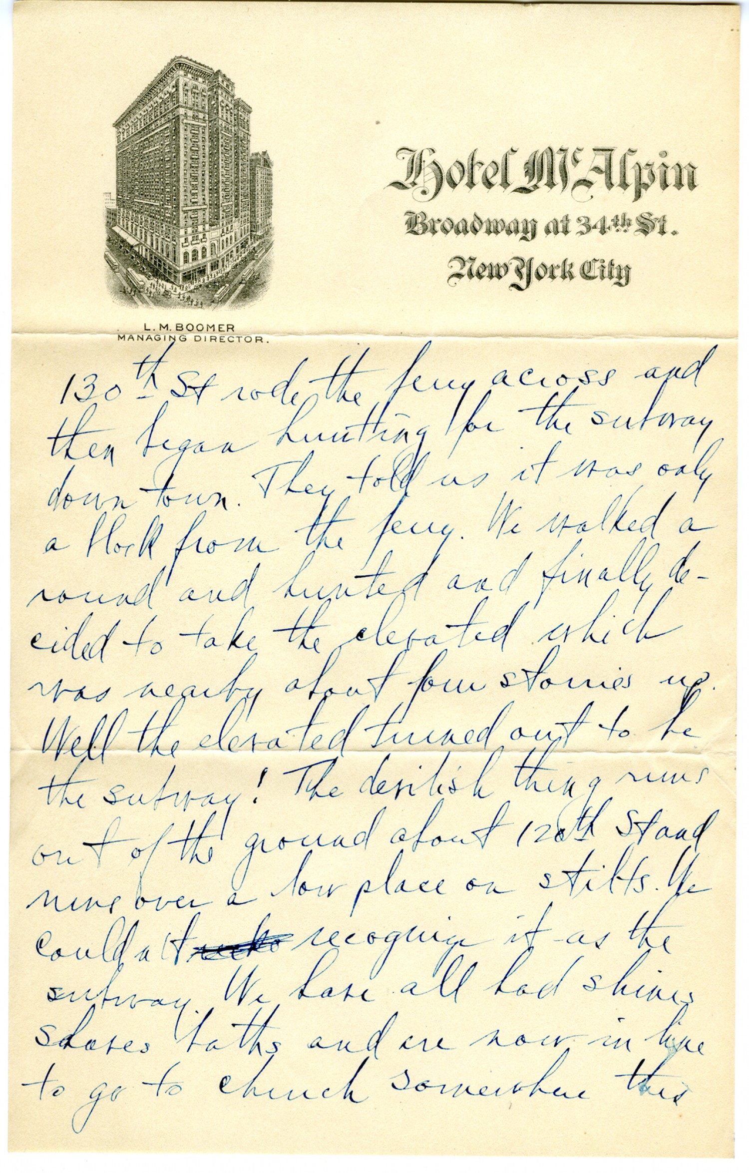 130th Street rode the ferry across and then began hunting for the subway downtown. They told us it was only a block from the ferry. We walked around and hunted and finally decided to take the elevated which was nearby about four stories up. Well the elevated turned out to be the subway! The devilish thing runs out of the ground about 120th Street and runs over a low place on stilts. We couldn't recognize it as the subway. We have all had shines shaves baths and are now in line to go to church somewhere this