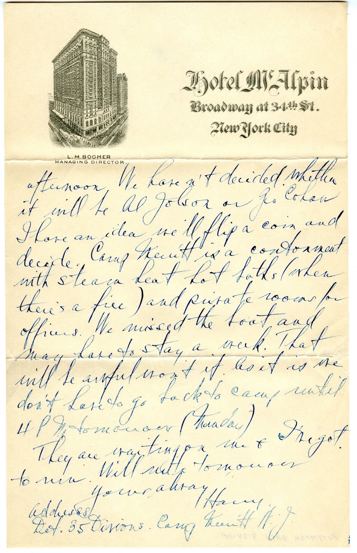 afternoon. We haven't decided whether it will be Al Jolson or Geo Cohan. I have an idea we'll flip a coin and decide. Camp Merritt is a cantonment with steam heat hot baths (when there's a fire) and private rooms for officers. We missed the boat and may have to stay a week. That will be awful won't it. As it is we don't have to go back to camp until 4:00 P.M. tomorrow (Monday) They are waiting on me and I've got to run. Will write tomorrow. Yours always Harry Address Lieut. 35 Division Camp Merritt [New Jersey]
