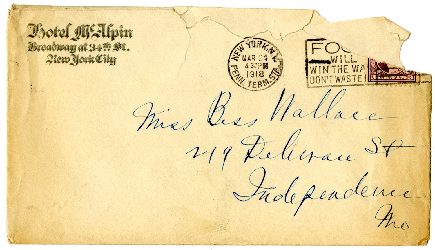 Hotel McAlpin Broadway at 34th St. New York City [Stamp] NEW YORK, N.Y. 1918 PENN. TERM. STA. Miss Bess Wallace 219 Deleware St. Independence [Missouri]