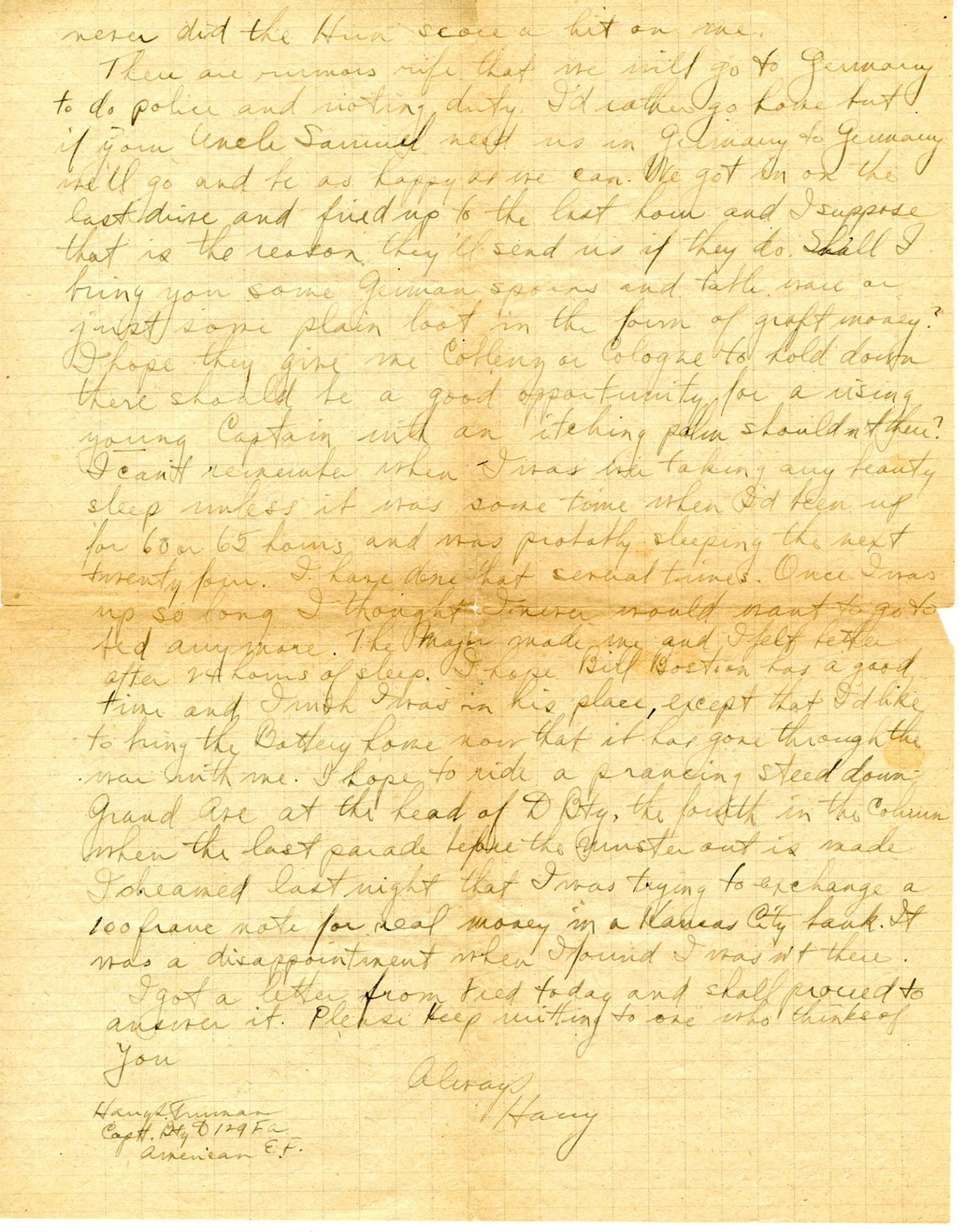 never did the Hun score a hit on me. There are rumors rife that we will go to Germany to do police and rioting duty. I'd rather go home but if your Uncle Samuel needs us in Germany, to Germany we'll go and be as happy as we can. We got in on the last drive and fired up to the last hour and I suppose that is the reason they'll send us if they do. Shall I bring you some German spoons and tableware or just some plain loot in the form of graft money? I hope they give me Coblenz or Cologne to hold down; there should be a good opportunity for a rising young captain with an itching palm, shouldn't there? I can't remember when I was ever taking any beauty sleep unless it was some time when I'd been up for 60 or 65 hours and was probably sleeping the next twenty four. I have done that several times. Once I was up so long I thought I never would want to go to bed anymore. The Major made me and I felt better after 24 hours of sleep. I hope Bill Bostian has a good time and I wish I was in his place, except that I'd like to bring the Battery home now that it has gone through the war with me. I hope to ride a prancing steed down Grand Ave. at the head of D Bty, the fourth in the column when the last parade before the muster out is made. I dreamed last night that I was trying to exchange a 100 franc note for real money in a Kansas City bank. It was a disappointment when I found I wasn't there. I got a letter from Fred today and shall proceed to answer it. Please keep writing to one who always thinks of you. Always, Harry Harry S Truman Capt Bty D 129 FA American E.F.