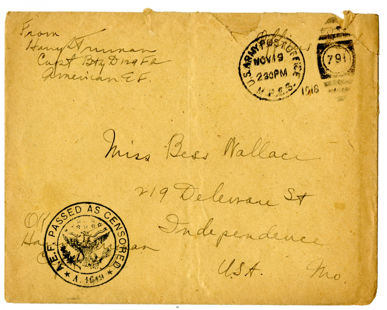 From Harry S Truman Capt Btry D 129 FA American EF [stamp] U.S. Army Post Office[November] 19 2:30 PM 1918 Officers [stamp] 791 Miss Bess Wallace 219 Wallace Independence USA [Missouri] OK Harry Truman Capt [stamp] A.E.F. Passed As Censored