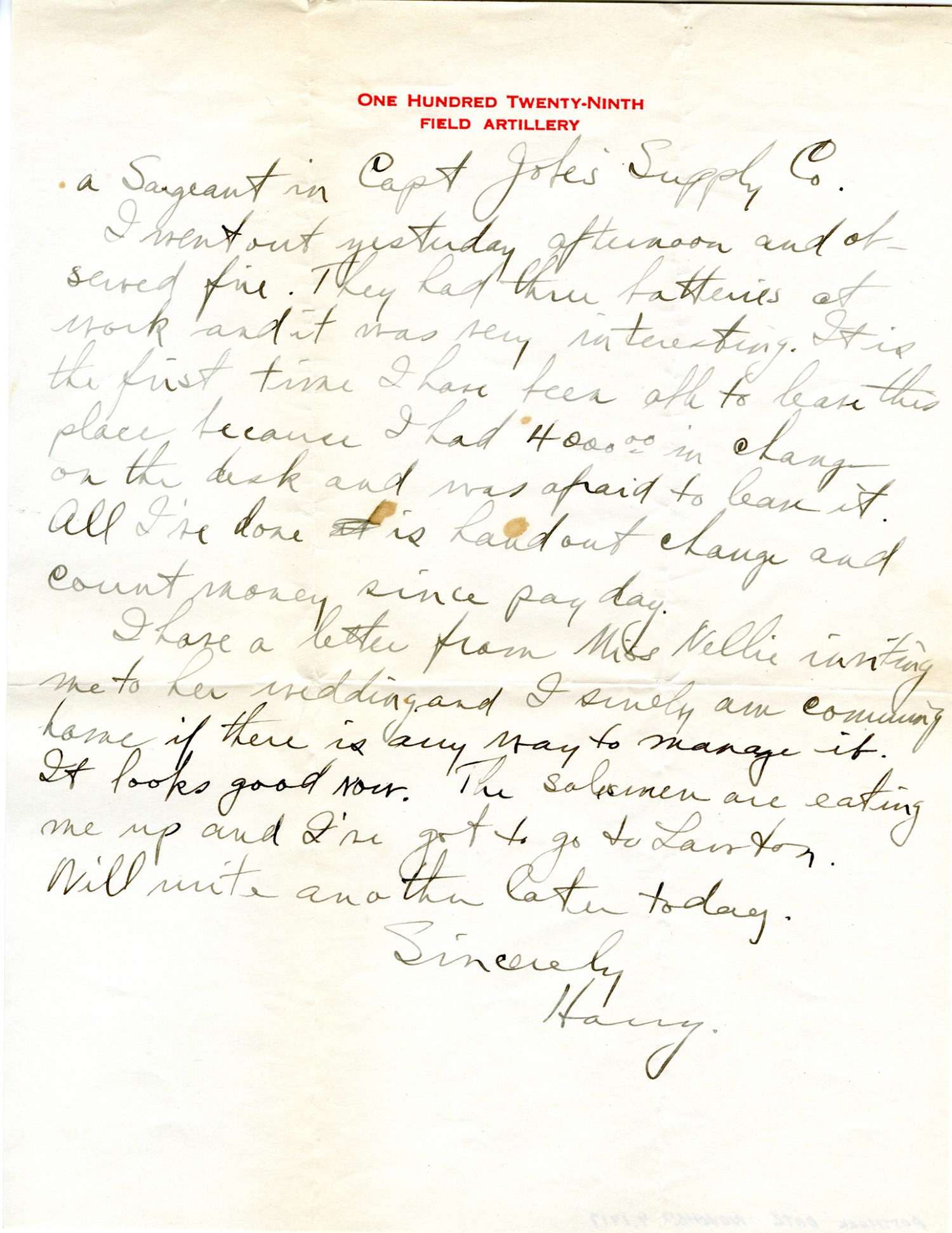 a Sergeant in Capt Jobe's Supply Co. I went out yesterday afternoon and observed fire. They had three batteries at work and it was very interesting. It is the first time I have been able to leave this place because I had 4000.00 in change on the desk and was afraid to leave it. All I've done is hand out change and count money since pay day. I have a letter from Miss Nellie inviting me to her wedding and I surely am coming home if there is any way to manage it. It looks good now. The salesmen are eating me up and I've got to go to Lawton. Will write another later today. Sincerely Harry.