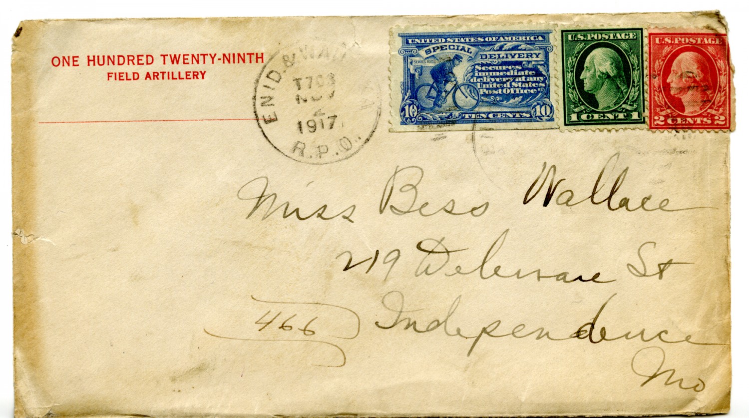 ONE HUNDRED TWENTY NINTH FIELD ARTILLERY [ms illegible: stamp] Miss Bess Wallace 219 Delaware St Independence [Missouri] 466
