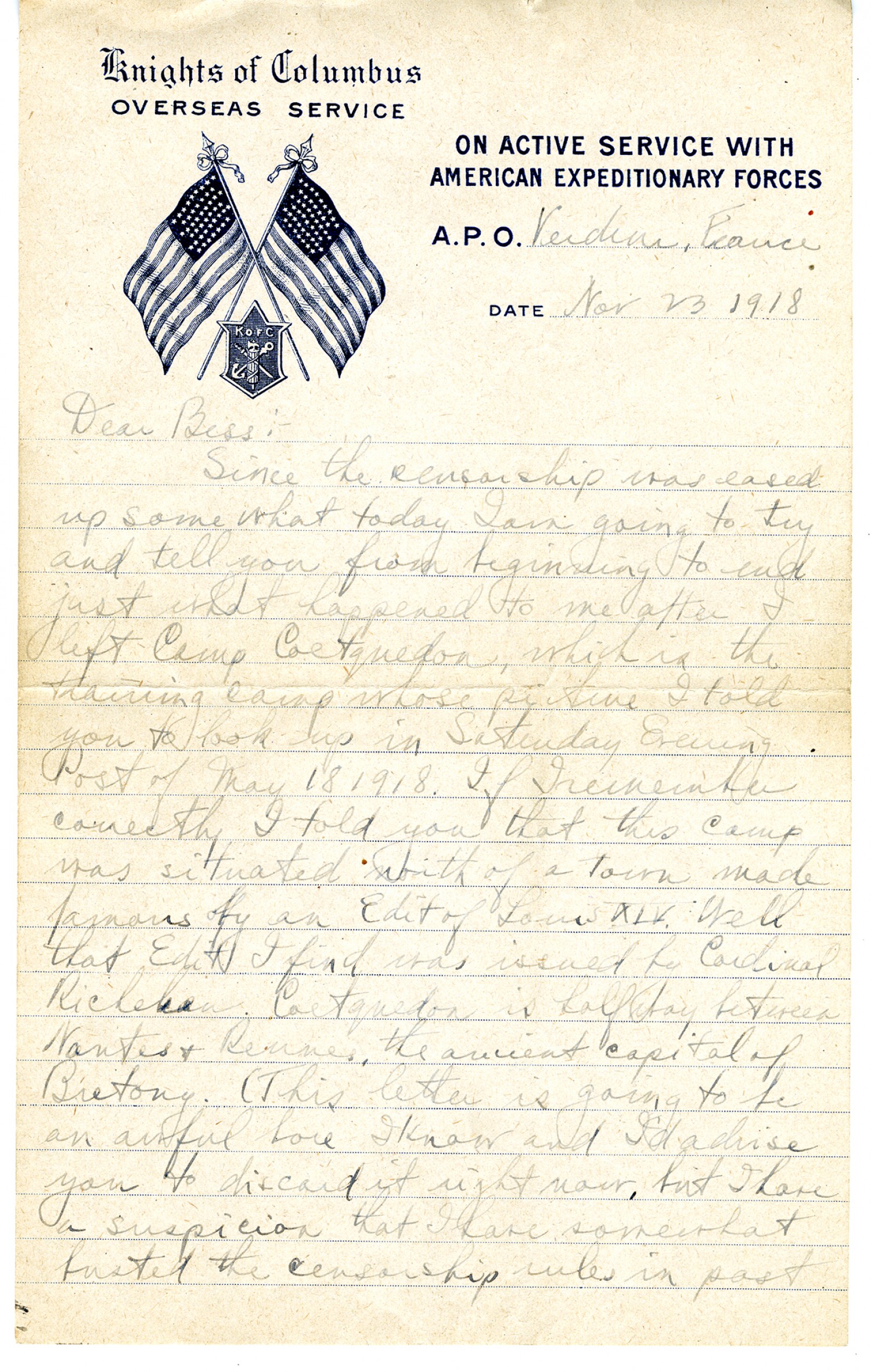 [Knights of Columbus letterhead] Verdun, France Nov. 23, 1918 Dear Bess: Since the censorship was eased up somewhat today I am going to try and tell you from the beginning to end and tell you just what happened to me after I left Camp Coetquidan, which is the training camp whose picture I told you to look up in Saturday Evening Post of May 18, 1918. If I remember correctly I told you this camp was situated north of a town made famous by an Edit of Louis XIV. Well, that Edit I find was issued by Cardinal Richelieu. Coetquidan is half way between Nantes & Rennes, the ancient capital of Britony. (This letter is going to be an awful bore I know and I'd advise you to discard it right now, but I have a suspicion that I have somewhat busted the censorship rules in past