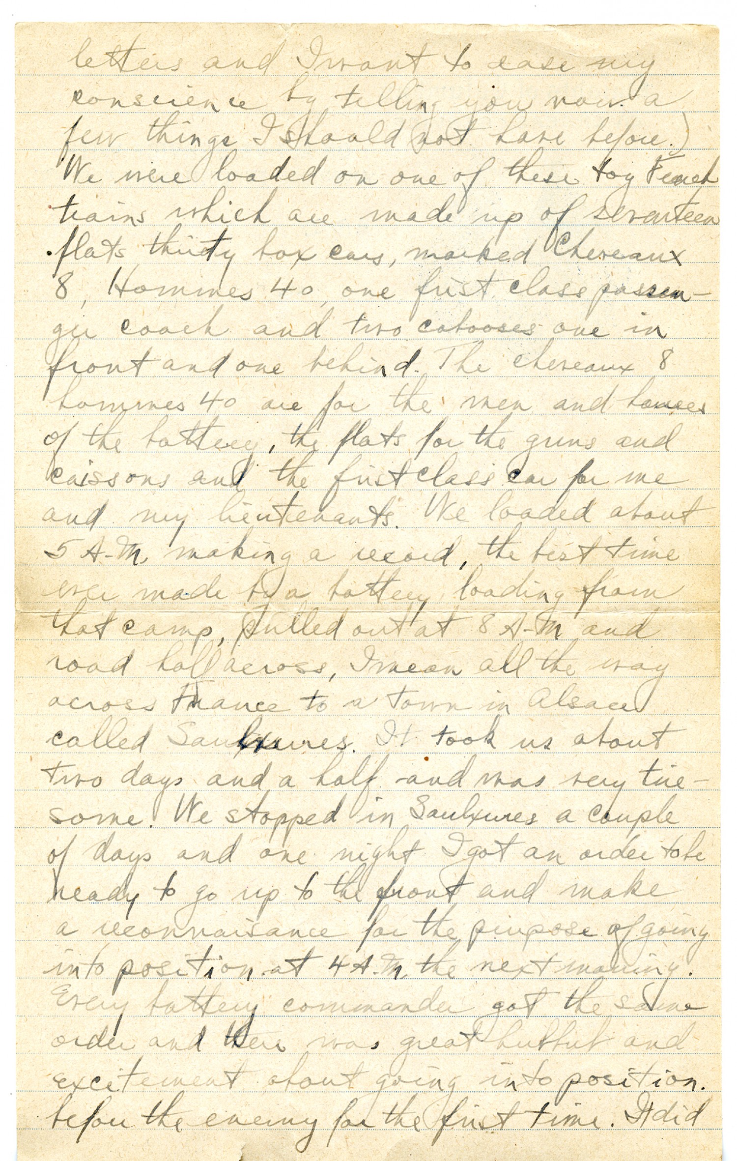 letters and I want to ease my conscience by telling you now a few things I should not have before). We were loaded on one of these toy French trains which are made up of seventeen flats thirty box cars, marked Cheveaux 8, Hommes 40, one first class passenger coach and two cabooses one in front and one behind. The Cheveaux 8 Hommes 40 are for the men and horses of the battery, the flats for the guns and caissons, and the first class car for me and my lieutenants. We loaded about 5 A.M. making a record, the best time ever made by a battery loading from that camp, pulled out at 8 A.M. and road half across, I mean all the way across France to a town in Alsace called Saulxures. It took us about two days and a half and was very tiresome. We stopped in Saulxures a couple of days and one night I got an order to be ready to go up to the front and make a reconnaisance for the purpose of going into position at 4 A.M. the next morning. Every battery commander got the same order and there was great hubbub and excitement about going into position before the enemy for the first time. It did