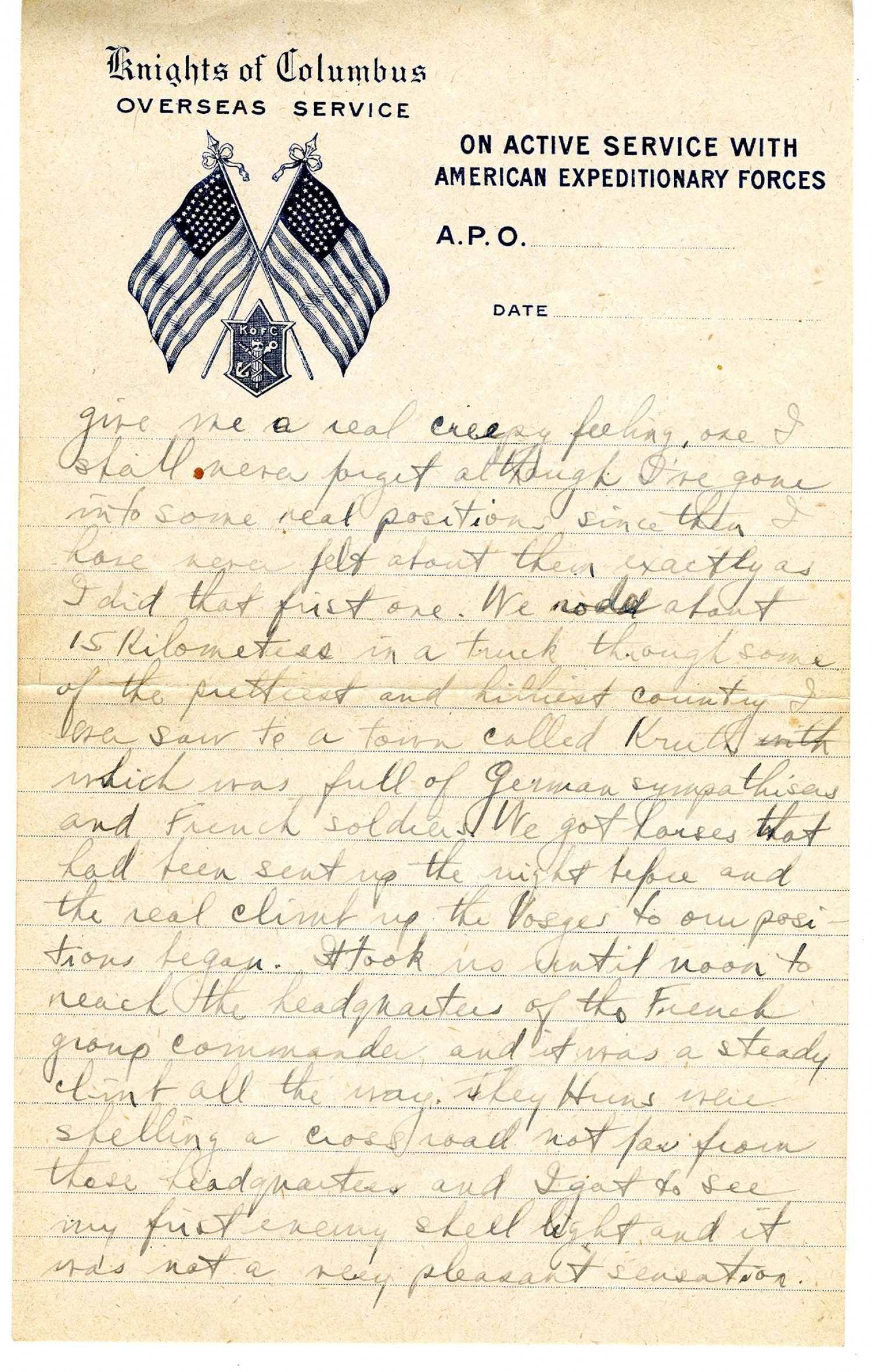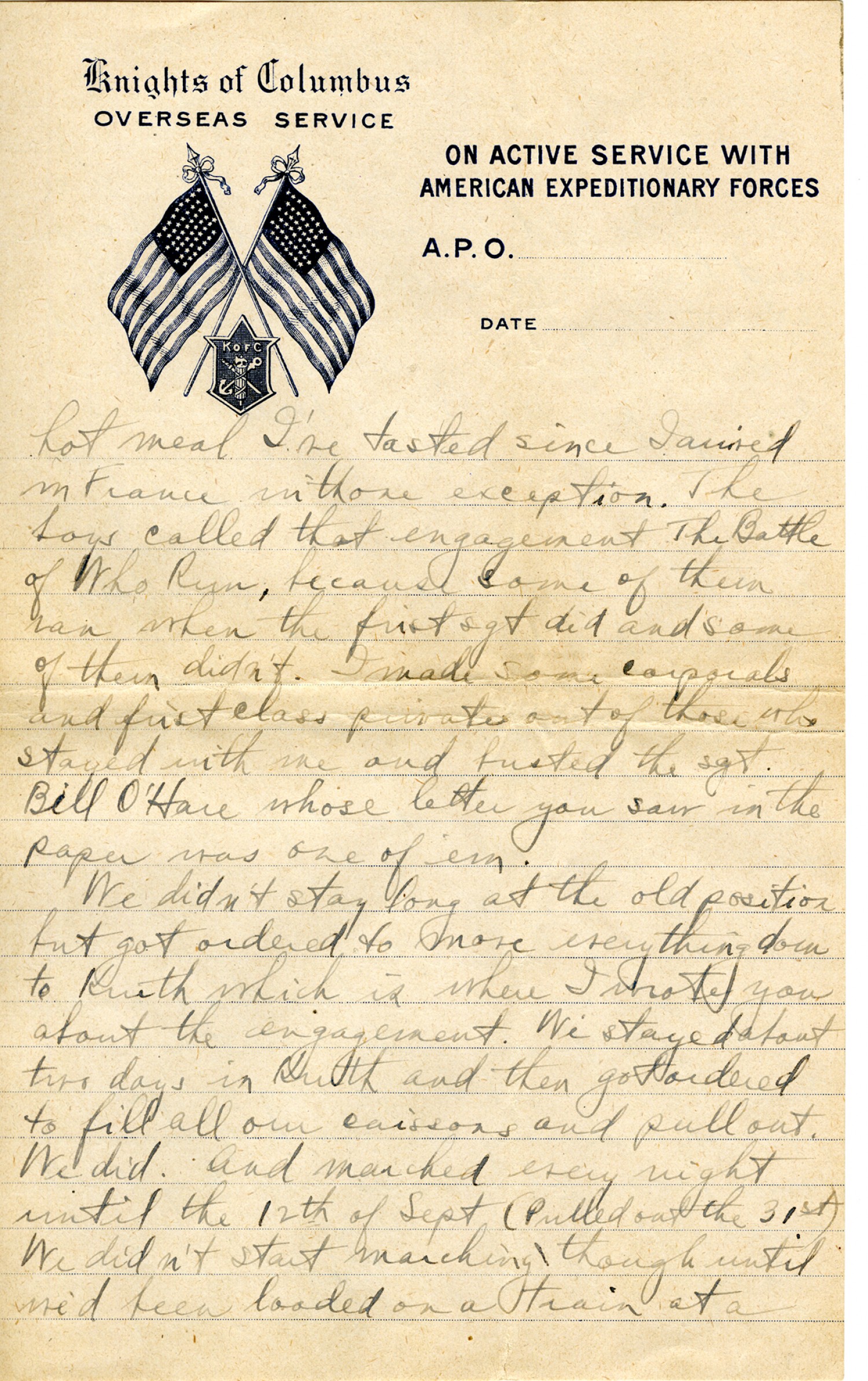 [Knights of Columbus letterhead] hot meal I've tasted since I arrived in France with one exception. The boys called that engagement The Battle of Who Run, because some of them ran when the first sgt. did and some of them didn't. I made some corporals and first class privates out of those who stayed with me and busted the sgt. Bill O'Hare whose letter you saw in the paper was one of 'em.We didn't stay long at the old position but got ordered to move everything down to Kruth which is where I wrote you about the engagement. We stayed about two days in Kruth and then got ordered to fill all our caissons and pull out. We did. And marched every night until the 12th of Sept (Pulled out the 31st). We didn't start marching though until we'd been loaded on a train at a