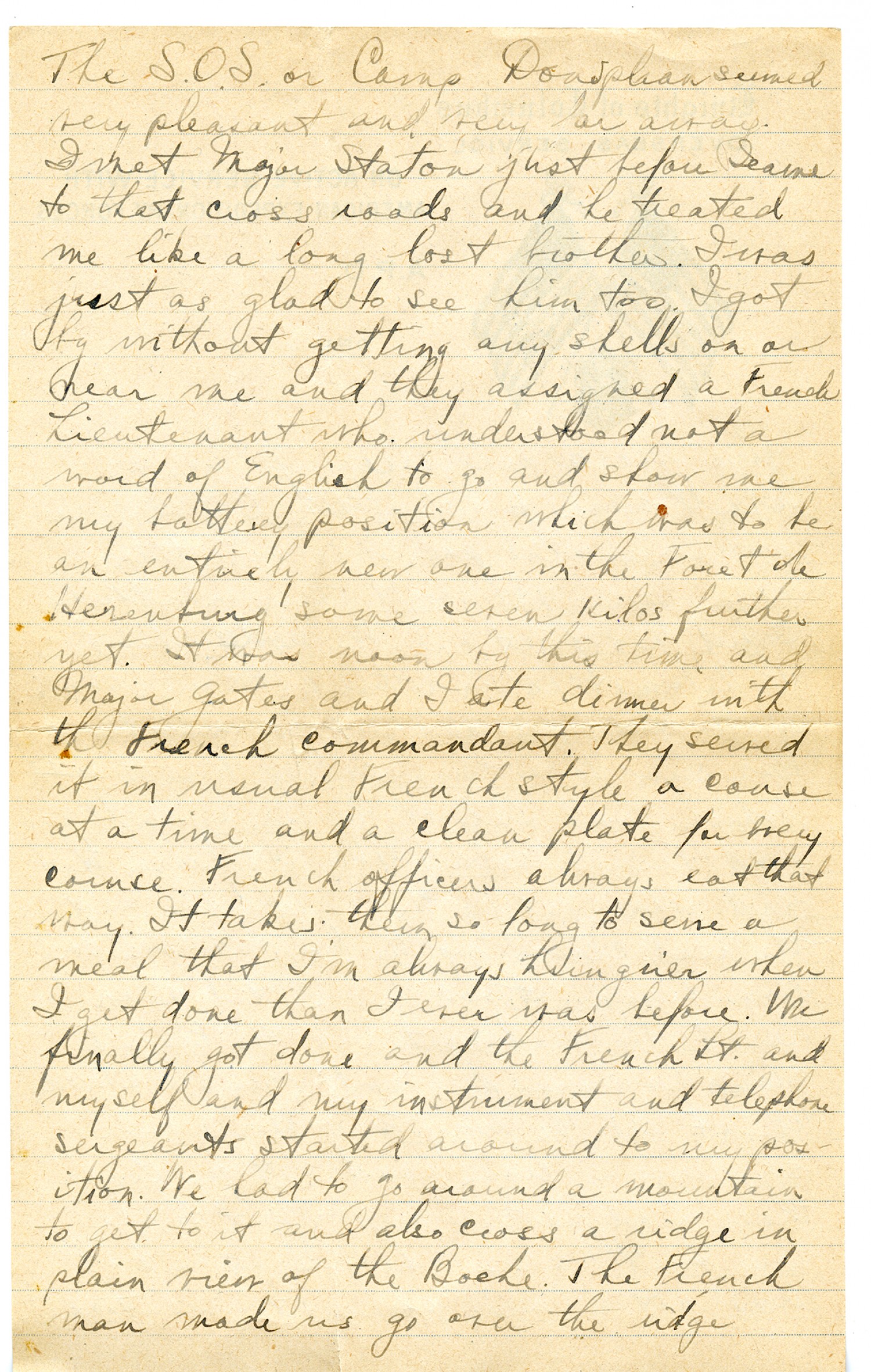 The S.O.S. or Camp Doniphan seemed very pleasant and very far away. I met Major Staton just before I came to that cross roads and he treated me like a long lost brother. I was just as glad to see him too. I got by without getting any shells on or near me and they assigned a French Lieutenant who understood not a word of English to go and show me my battery position which was to be an entirely new one in Foret de Herenburg some seven kilos further yet. It was noon by this time and Major Gates and I ate dinner with the French commandant. They served it in usual French style a course at a time and a clean plate for every course. French officers always eat that way. It takes them so long to serve a meal that I'm always hungrier when I get done than I ever was before. We finally got done and the French Lt. and myself and my instrument and telephone sergeants started around to my position. We had to go around a mountain to get to it and also cross a ridge in plain view of the Boche. The French man made us go over the ridge