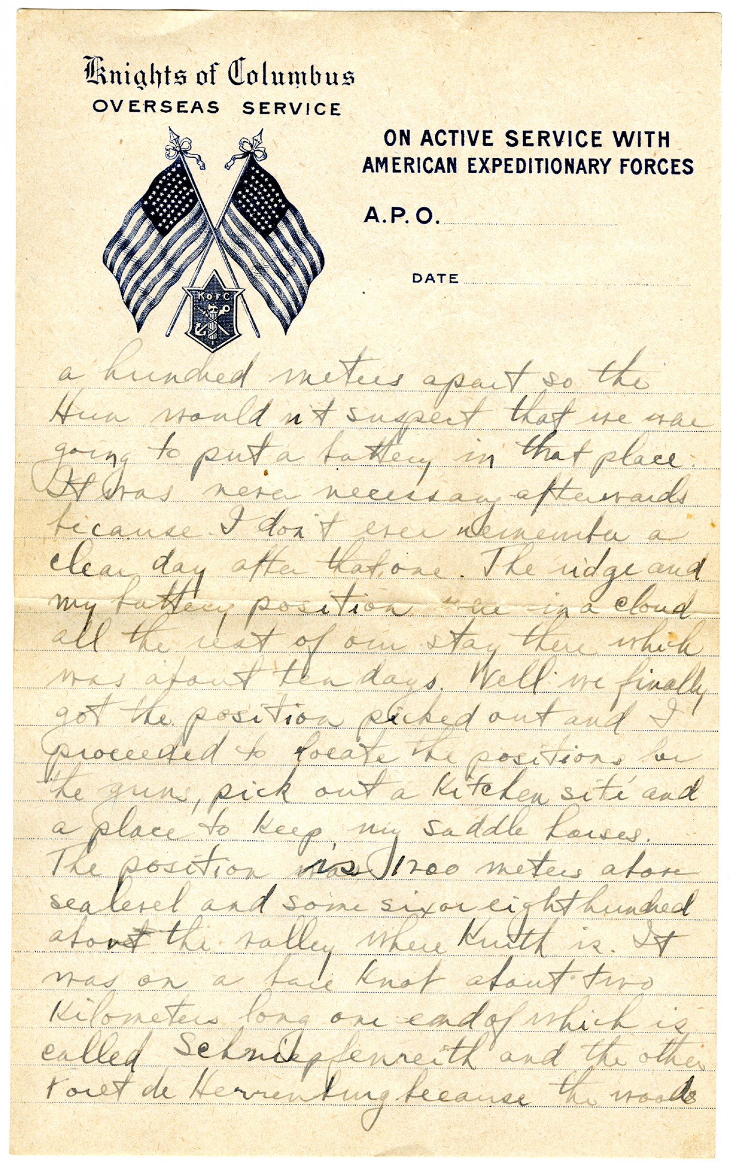 [Knights of Columbus letterhead] a hundred meters apart so the Hun would not suspect that we were going to put a battery in that place. It was never necessary afterwards because I don't ever remember a clear day after that one. The ridge and my battery position were in a cloud all the rest of our stay there which was about ten days. Well we finally got the position picked out and proceeded to locate the positions for the guns, pick out a kitchen site and a place to keep my saddle horses. The position is 1200 meters above sea level and some six or eight hundred above the valley where Kruth is. It was on a bare knot about two kilometers long one end of which is called Schniepfenreith and the other Foret de Herrenburg because the woods