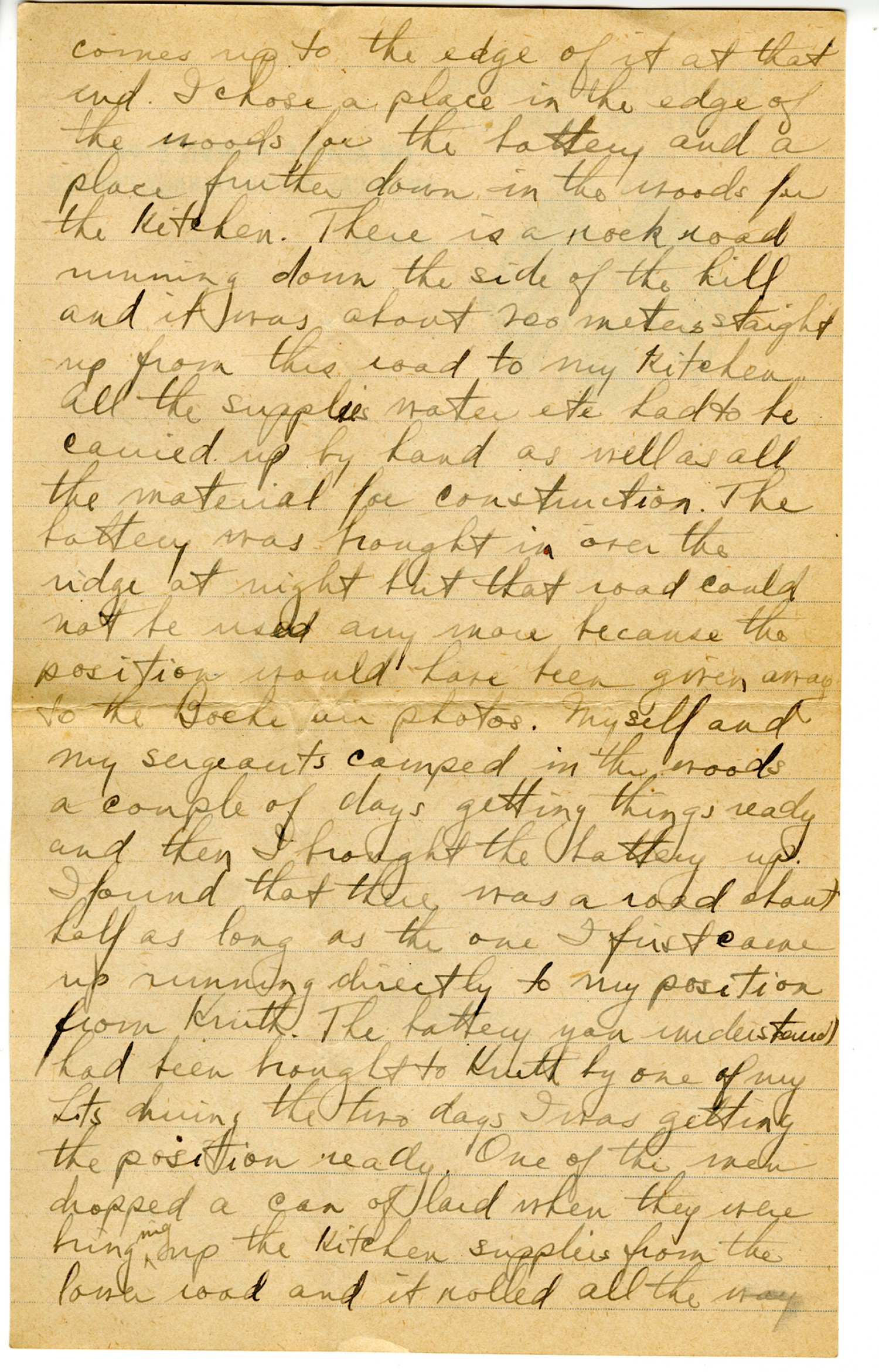 comes up to the edge of it at that end. I chose a place in the edge of the woods for the battery and a place further down in the woods for the kitchen. There is a rock road running down the side of the hill and it was about 200 meters straight up from this road to my kitchen. All the supplies, water etc. had to be carried up by hand as well as all the material for construction. The battery was brought in over the ridge at night but that road could not be used any more because the positions would have been given away to the Boche air photos. Myself and my sergeants camped in the woods a couple of days getting things ready and then I brought the battery up. I found that there was a road about half as long as the one I first came up running directly to my position from Kruth. The battery you understand had been brought to Kruth by one of my Lts. during the two days I was getting the position ready. One of the men dropped a can of lard when they were bringing up the kitchen supplies from the lower road and it rolled all the way