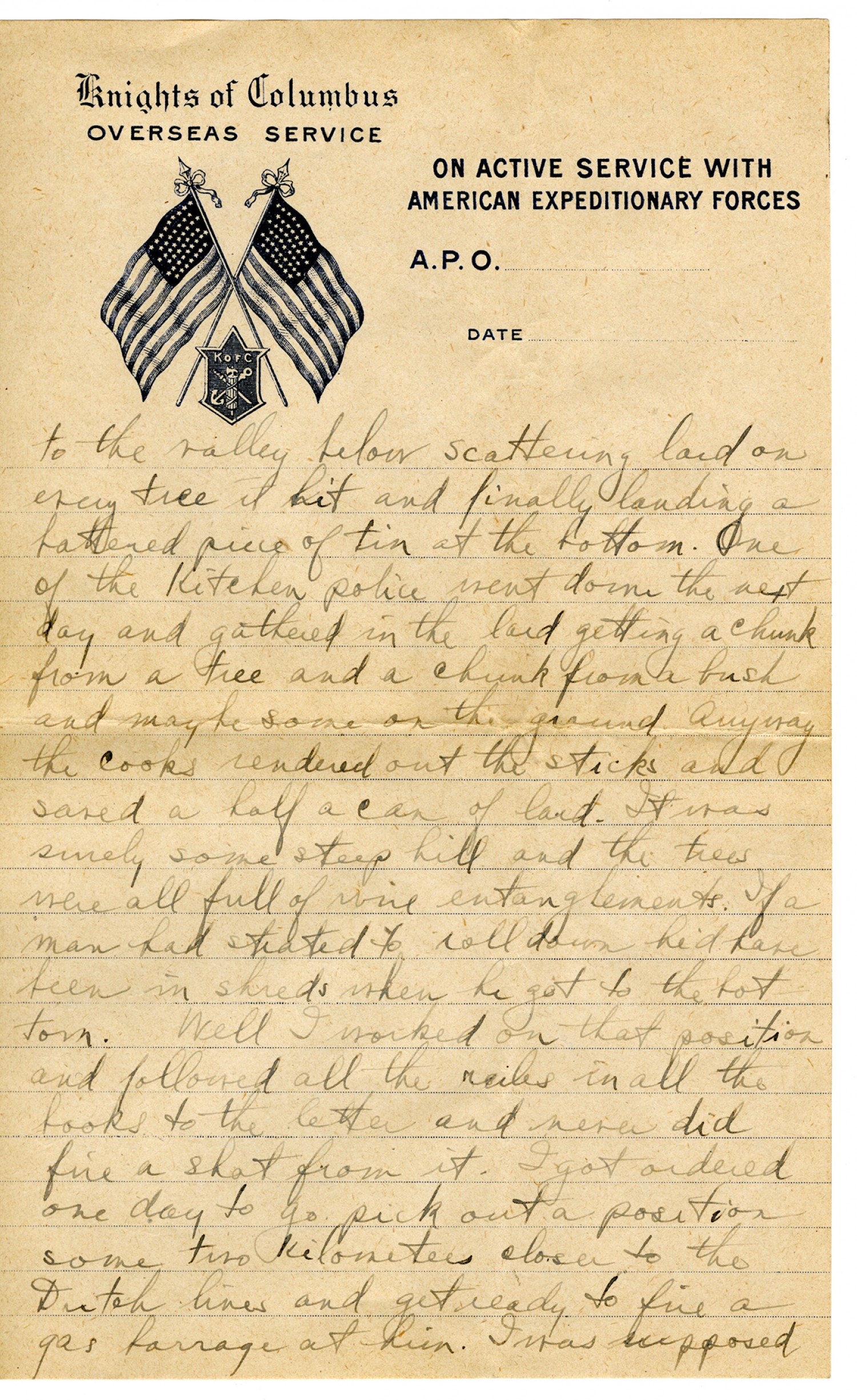 [Knights of Columbus letterhead] to the valley below scattering lard on every tree it hit and finally landing a battered piece of tin at the bottom. One of the kitchen police went down the next day and gathered in the lard getting a chunk from a tree and a chunk from a bush and maybe some on the ground. Anyway the cooks rendered out the sticks and saved a half a can of lard. It was surely some steep hill and the trees were all full of wire entanglements. If a man had started to roll down he'd have been in shreds when he got to the bottom. Well I worked on that position and followed all the rules in all the books to the letter and never did fire a shot from it. I got ordered one day to go pick out a position some two kilometers close to the Dutch lines and get ready to fire a gas barrage at him. I was supposed