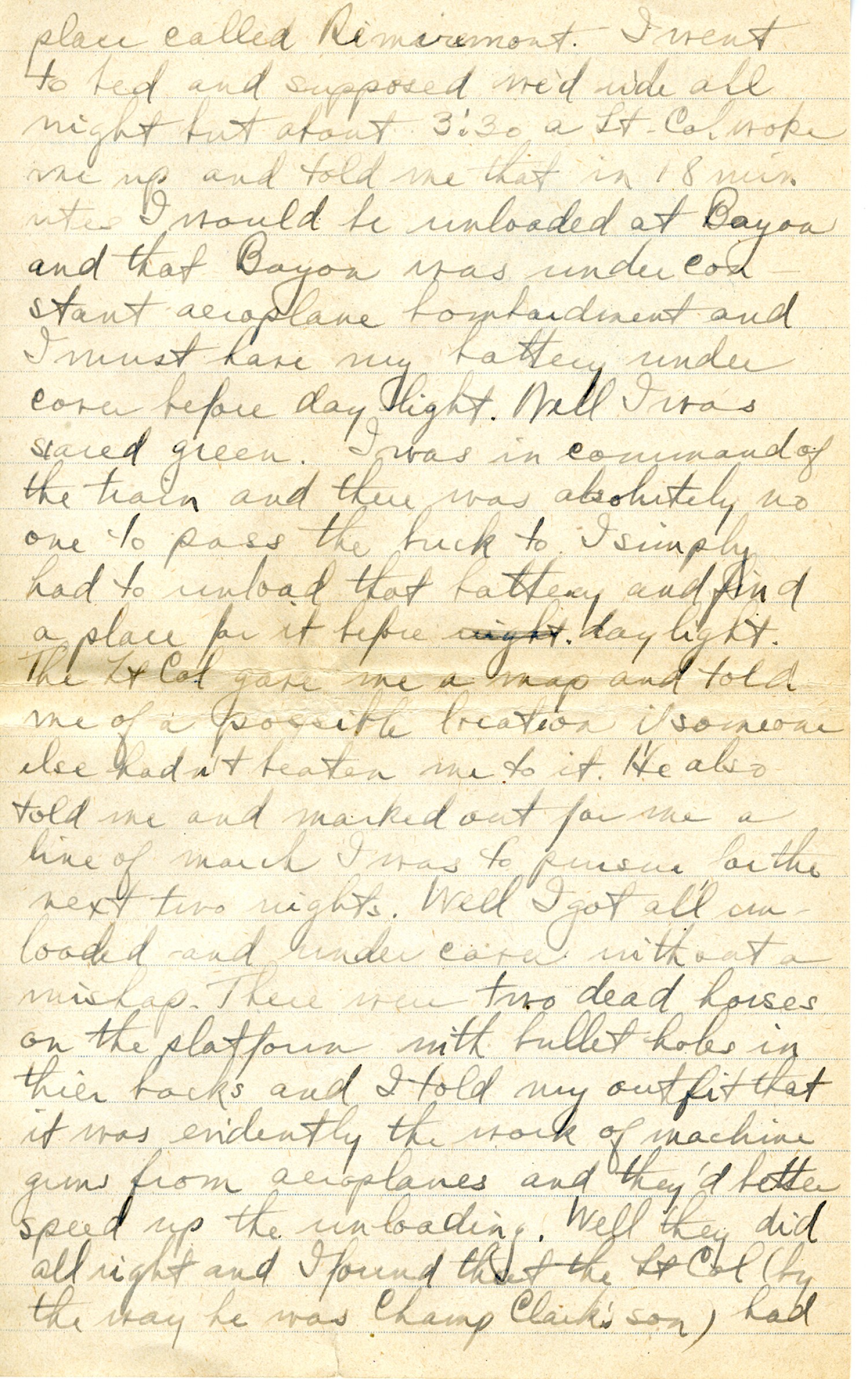 place called Remiremont. I went to bed and supposed we'd ride all night but about 3:30 a Lt. Col. woke me up and told me that in 18 minutes I would be unloaded at Bayon and that Bayon was under constant aeroplane bombardment and I must have my battery under cover before daylight. Well I was scared green. I was in command of the train and there was absolutely no one to pass the buck to. I simply had to unload that battery and find a place for it before day light. The Lt. Col. gave me a map and told me of a possible location if someone else hadn't beaten me to it. He also told me and marked out for me a line of march I was to pursue on the next two nights. Well I got all unloaded and under cover without a mishap. There were two dead horses on the platform with bullet holes in thier [sic] backs and I told my outfit that it was evidently the work of machine guns from aeroplanes and they'd better speed up the unloading. Well they did all right and I found that the Lt. Col (by the way he was Champ Clark's son) had