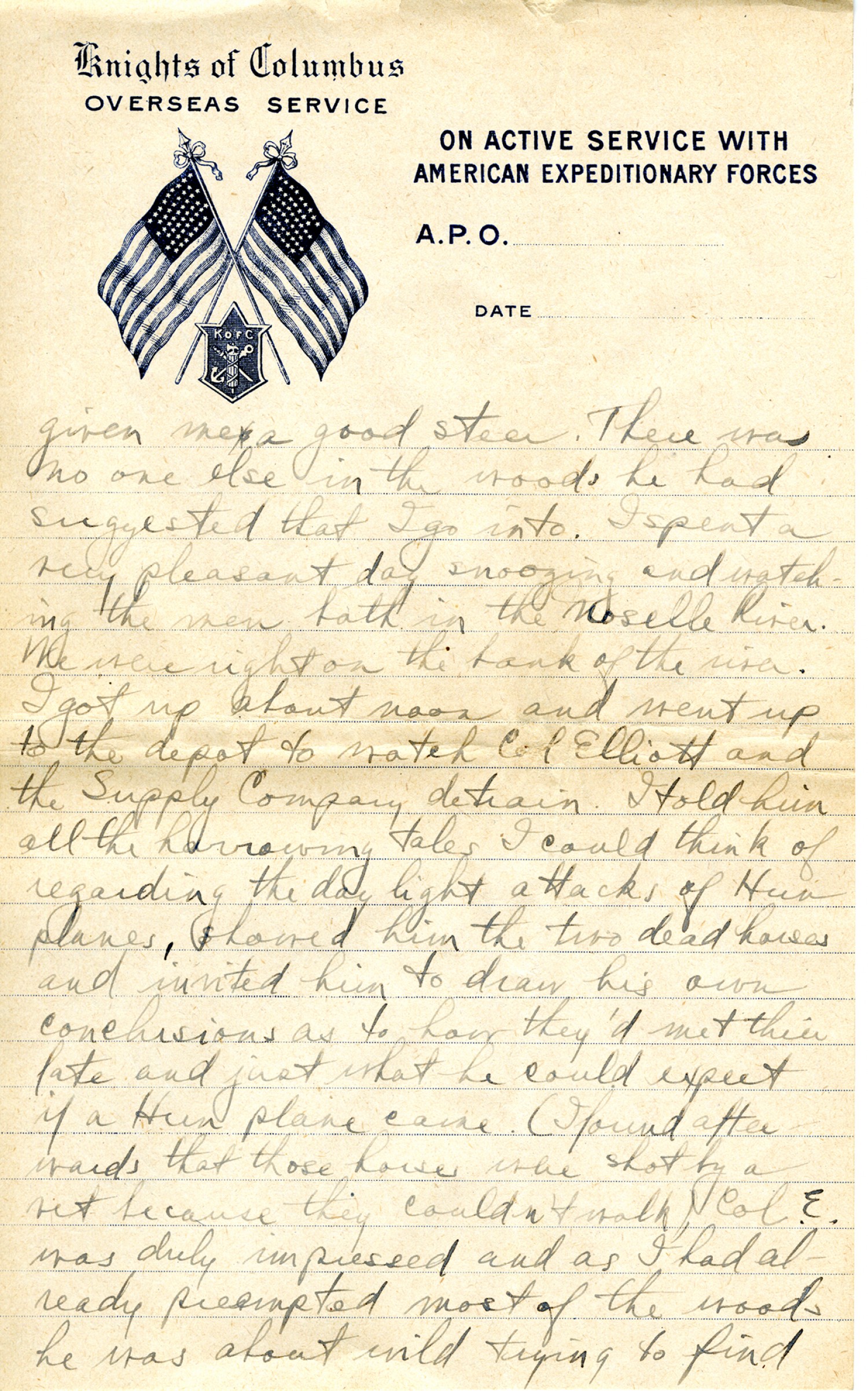 [Knights of Columbus letterhead] given me a good steer. There was no one else in the woods he had suggested that I go into. I spent a very pleasant day snoozing and watching the men bath in the Moselle River. We were right on the bank of the river. I got up about noon and went up to the depot to watch Col. Elliott and the Supply Company detrain. I told him all the harrowing tales I could think of regarding the daylight attacks of Hun planes, showed him the two dead horses and invited him to draw his own conclusions as to how they'd met their fate and just what he could expect if a Hun plane came. (I found after wards that those horses were shot by a vet because they couldn't walk). Col. E. was duly impressed and as I had already preempted most of the woods he was about wild trying to find
