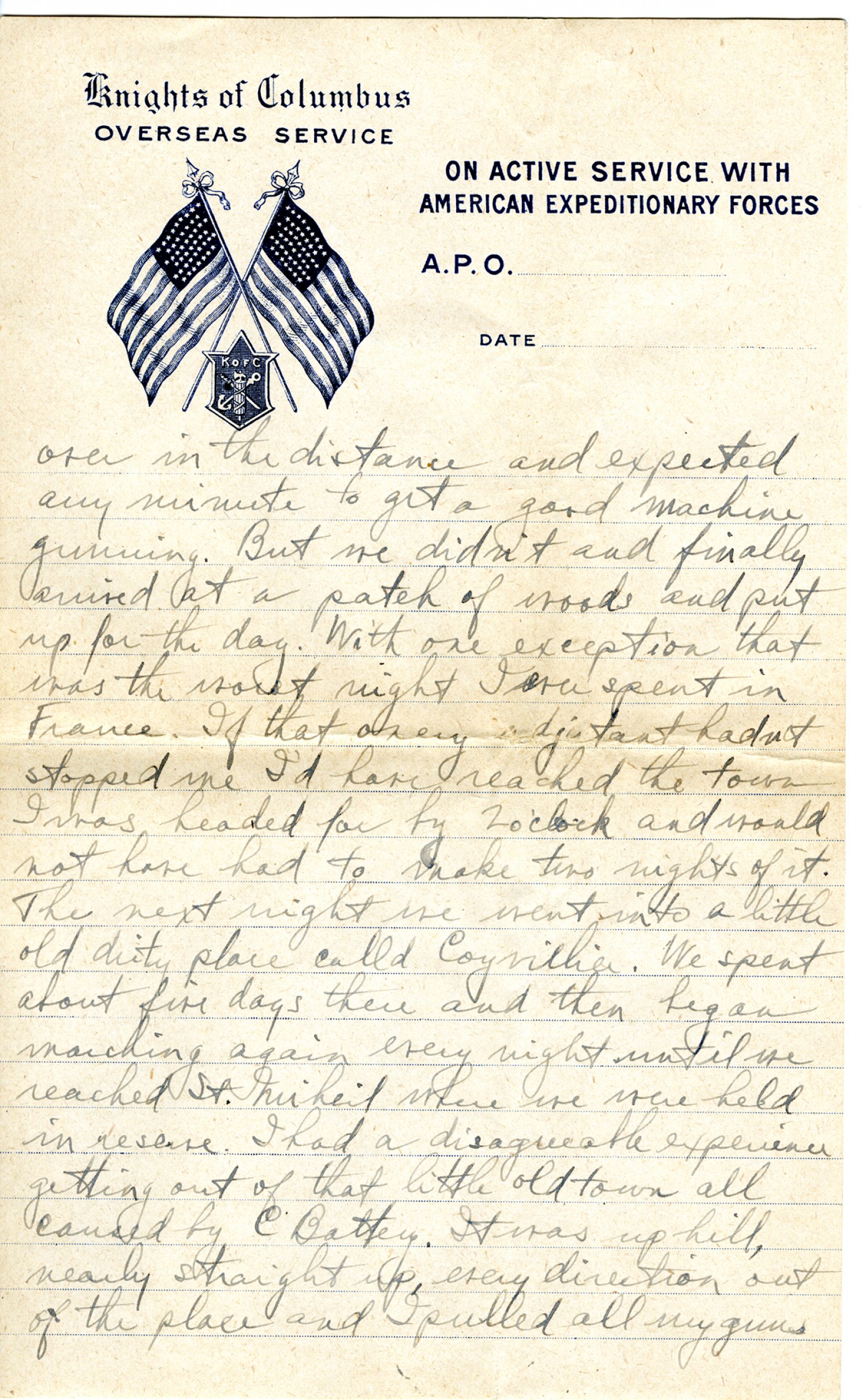 [Knights of Columbus letterhead] over in the distance and expected any minute to get a good machine gunning. But we didn't and finally arrived at a patch of woods and put up for the day. With one exception that was the worst night I ever spent in France. If that onery adjutant hadn't stopped me I'd have reached the town I was headed for by 2 o'clock and would not have had to make two nights of it. The next night we went into a little old dirty place called Coyvillier. We spent about five days there and then began marching again every night until we reached St. Mihiel where we were held in reserve. I had a disagreeable experience getting out of that little old town all caused by C Battery. It was up hill nearly straight up every direction out of the place and I pulled all