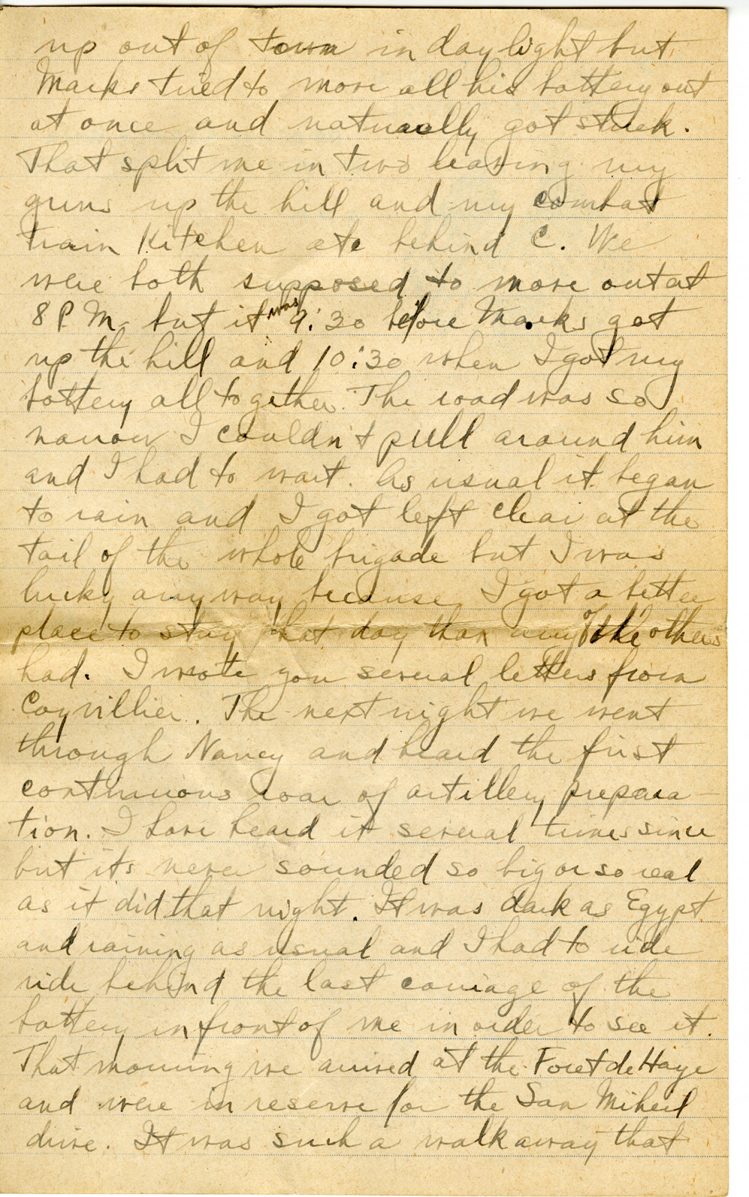my guns up out of town in daylight but Marks tried to move all his battery out at once and naturally got stuck. That split me in two leaving my guns up the hill and my combat train kitchen etc. behind C. We were both supposed to move out at 8 P.M. but it was 9:30 before Marks got up the hill and 10:30 when I got my battery all together. The road was so narrow I couldn't pull around him and I had to wait. As usual it began to rain and I got left clear at the tail of the whole brigade but I was lucky anyway because I got a better place to stay that day than any of the others had. I wrote you several letters from Coyvillier. The next night we went through Nancy and heard the first continuous roar of artillery preparation. I have heard it several times since but it's never sounded so big or so real as it did that night. It was dark as Egypt and raining as usual and I had to ride behind the last carriage of the battery in front of me in order to see it. That morning we arrived at the Foret de Haye and were in reserve for the San Miheil drive. It was such a walk away that