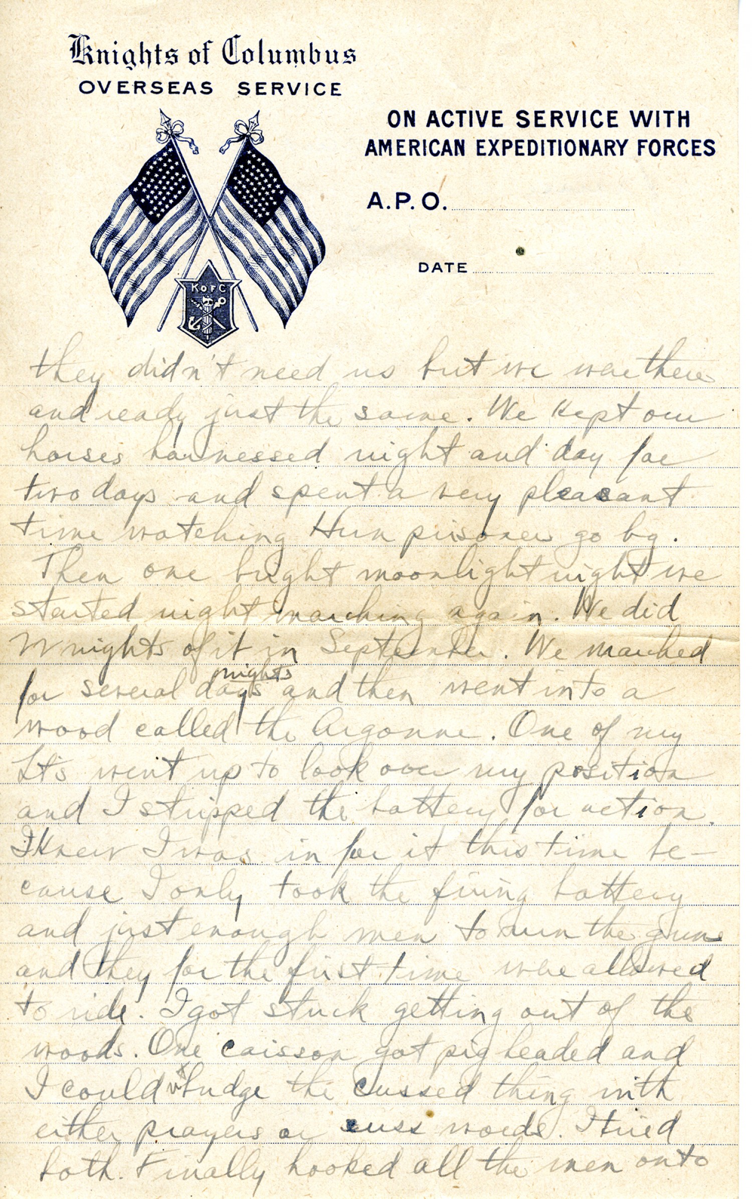 [Knights of Columbus letterhead] they didn't need us but we were there and ready just the same. We kept our horses harnessed night and day for two days and spent a very pleasant time watching Hun prisoners go by. Then one bright moonlight night we started night marching again. We did 22 nights of it in September. We marched for several nights and then went into a wood called the Argonne. One of my Lts went up to look over my position and I stripped the battery for action. I knew I was in for it this time because I only took the firing battery and just enough men to run the guns and they for the first time were allowed to ride. I got stuck getting out of the woods. One caisson got pig headed and I couldn't budge the cussed thing with either prayers or cuss words. I tried both. Finally hooked all the men onto