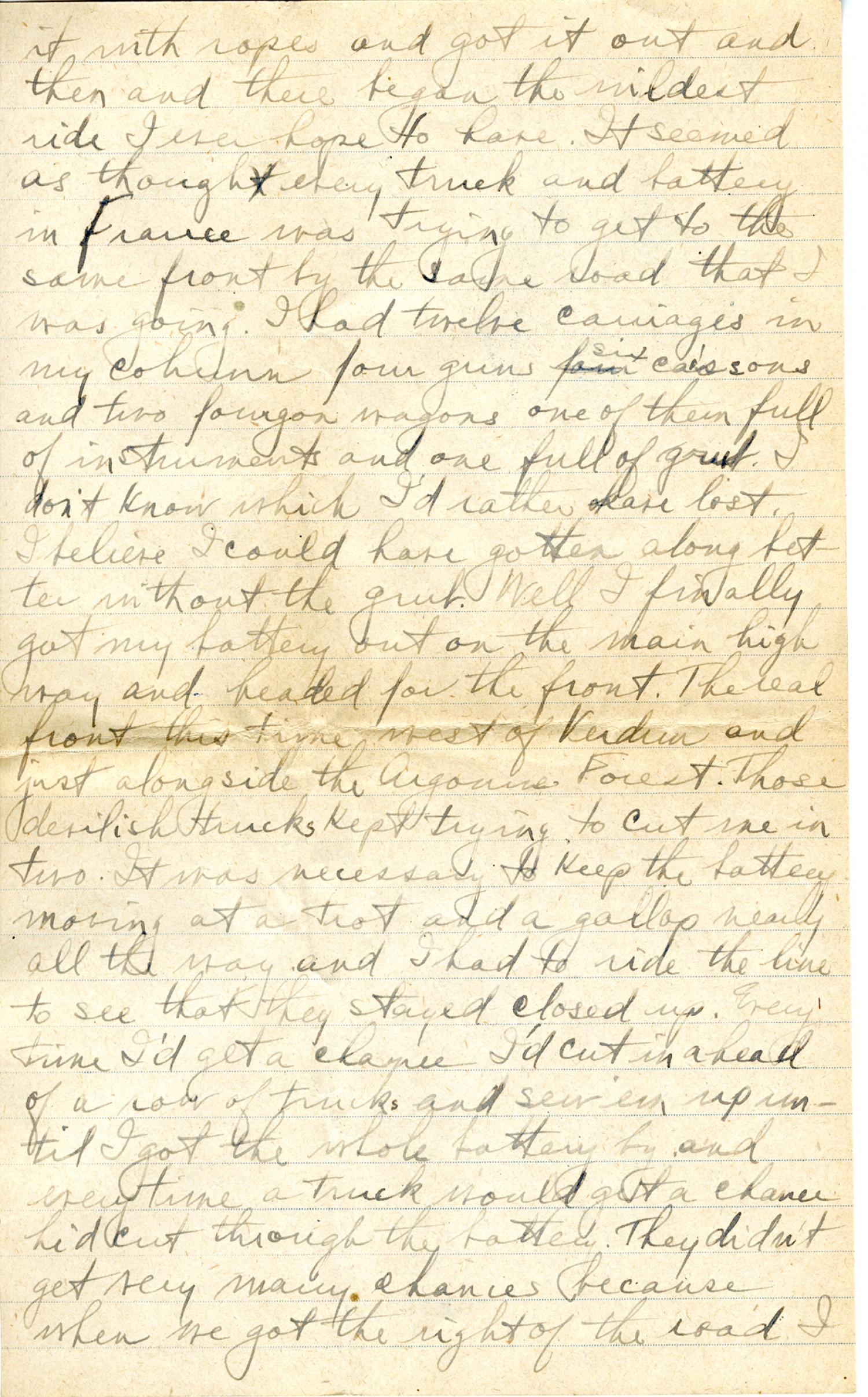 it with ropes and got it out and then and there began the wildest ride I ever hope to have. It seemed as though every truck and battery in France was trying to get to the same front by the same road that I was going. I had twelve carriages in my column four guns, six caissons, and two fourgun wagons one of them full of instruments and one full of grub. I don't know which I'd rather have lost. I believe I could have gotten along better without the grub. Well, I finally got my battery out on the main highway and headed for the front. The real front this time west of Verdun and just alongside the Argonne Forest. Those devilish trucks kept trying to cut me in two. It was necessary to keep the battery moving at a trot and a gallop nearly all the way and I had to ride the line to see that they stayed closed up. Every time I'd get a chance I'd cut in ahead of a row of trucks and sew 'em up until I got the whole battery by and every time a truck would get a chance he'd cut through the battery. They didn't get very many chances because when we got the right of the road I