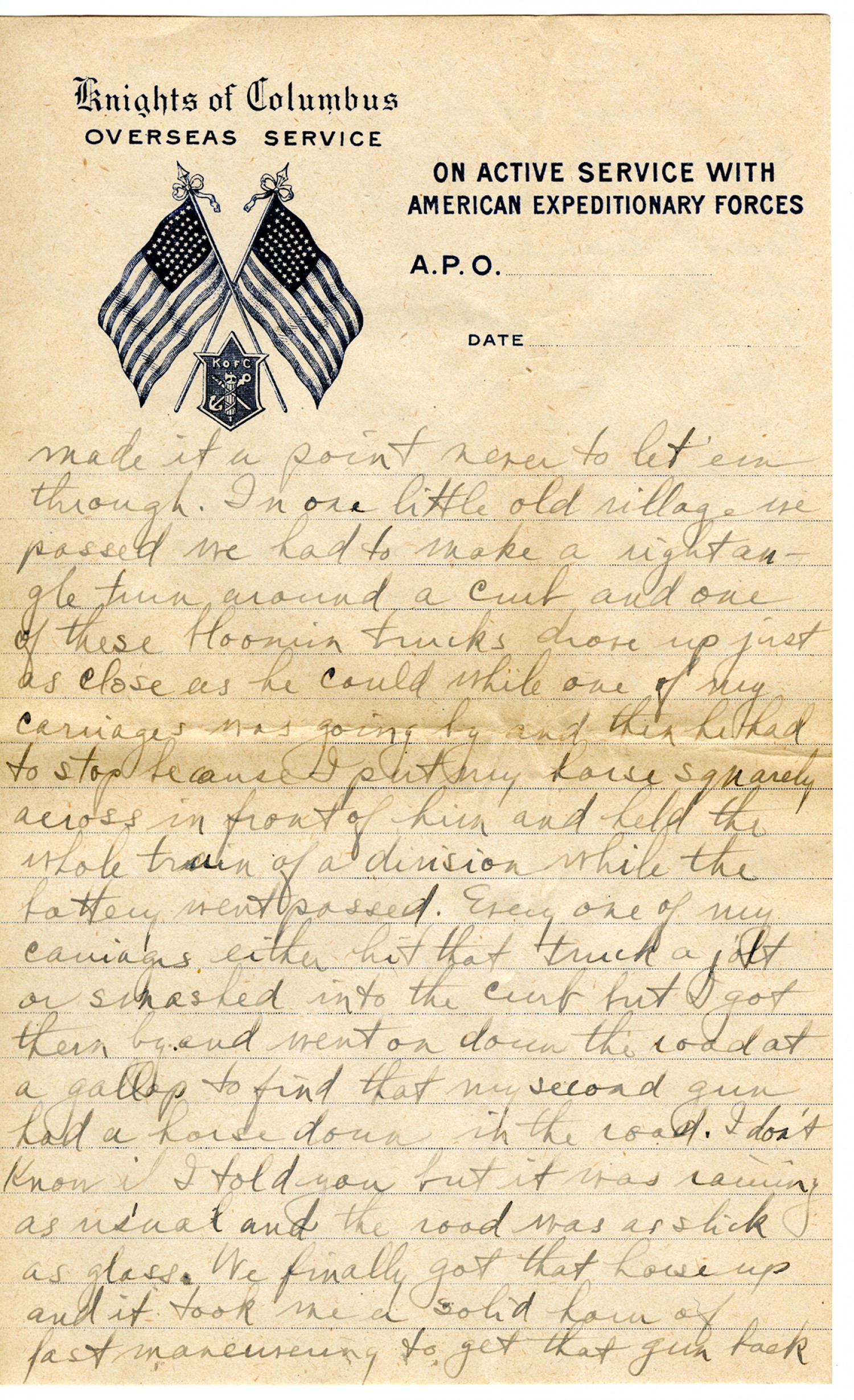 [Knights of Columbus lettehead] made it a point never to let 'em through. In one little old village we passed we had to make a right angle turn around a curb and one of these bloomin' trucks drove up just as close as he could while one of my carriages was going by and then he had to stop because I started putting my horse squarely across in front of him and held the whole train of a division while the battery went passed. Every one of my carriages either hit that truck a jolt or smashed into the curb but I got them by and went on down the road at a gallop to find that my second gun had a horse down in the road. I don't know if I told you but it was raining as usual and the road was as slick as glass. We finally got that horse up and it took me a solid hour of fast maneuvering to get that gun back
