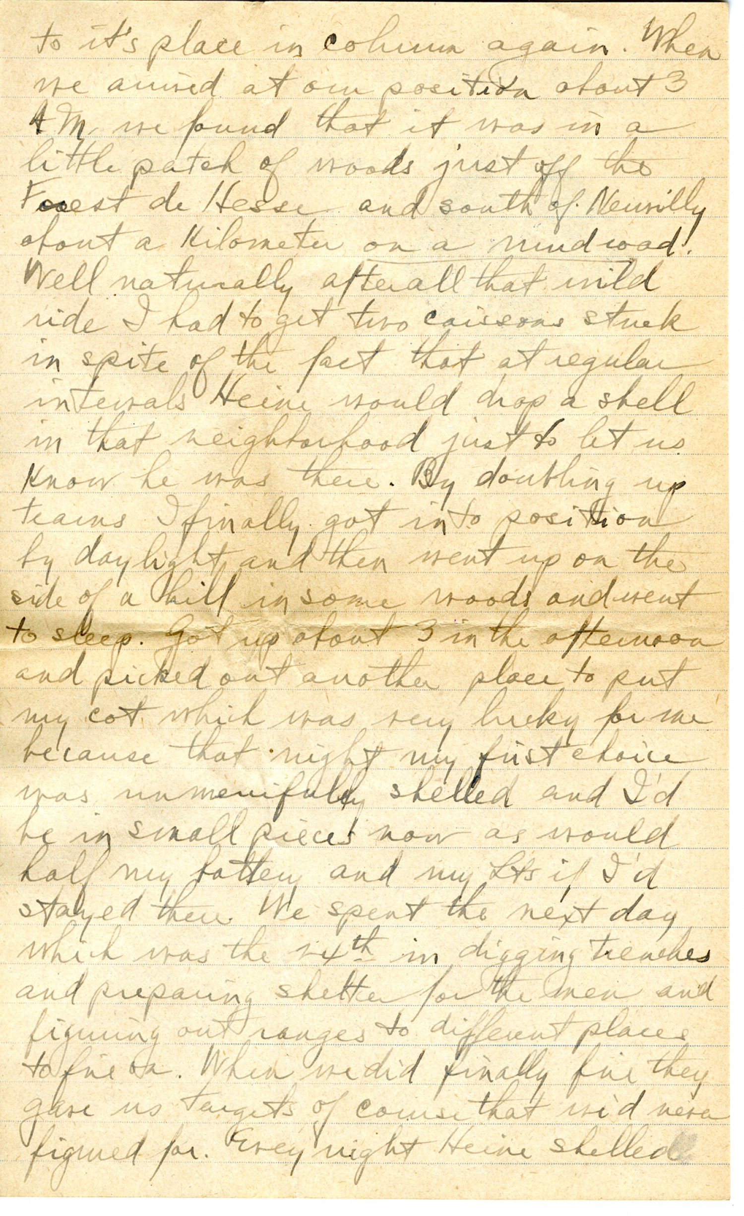 to its place in column again. When we arrived at our position about 3 A.M. we found that it was in a little patch of woods just off the Forest de Hesse and south of Neuvilly about a kilometer on a mud road. Well naturally after all that wild ride I had to get two caissons stuck in spite of the fact that at regular intervals Heine would drop a shell in that neighborhood just to let us know he was there. By doubling up teams I finally got into position by daylight and then went up on the side of a hill in some woods and went to sleep. Got up about 3 in the afternoon and picked out another place to put my cot which was very lucky for me because that night my first choice was unmercifully shelled and I'd be in small pieces now as would half my battery and my Lts if I'd stayed there. We spent the next day, which was the 24th in digging trenches and preparing shelter for the men and figuring out ranges to different places to fire on. When we did finally fire they gave us targets of course that we'd never figured for. Every night Heine shelled