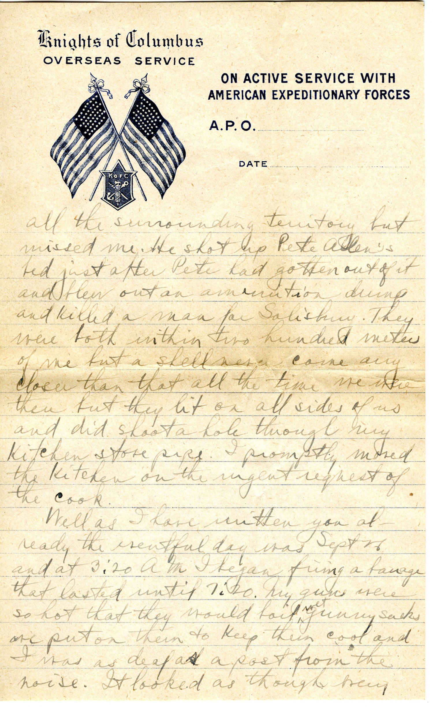 [Knights of Columbus letterhead] all the surrounding territory but missed me. He shot up Pete Allen's bed just after Pete had gotten out of it and blew out an ammunition dump and killed a man for Salisbury. They were both within two hundred meters of me but a shell never came any closer than that all the time we were there but they lit on all sides of us and did shoot a hole through my kitchen stove pipe. I promptly moved the kitchen on the urgent request of the cook. Well as I have written you already the eventful day was Sept. 26 and at 3:20 A.M. I began firing a barrage that lasted until 7:20. My guns were so hot that they would boil wet gunny sacks we put on them to keep them cool and I was as deaf as a post from the noise. It looked as though every