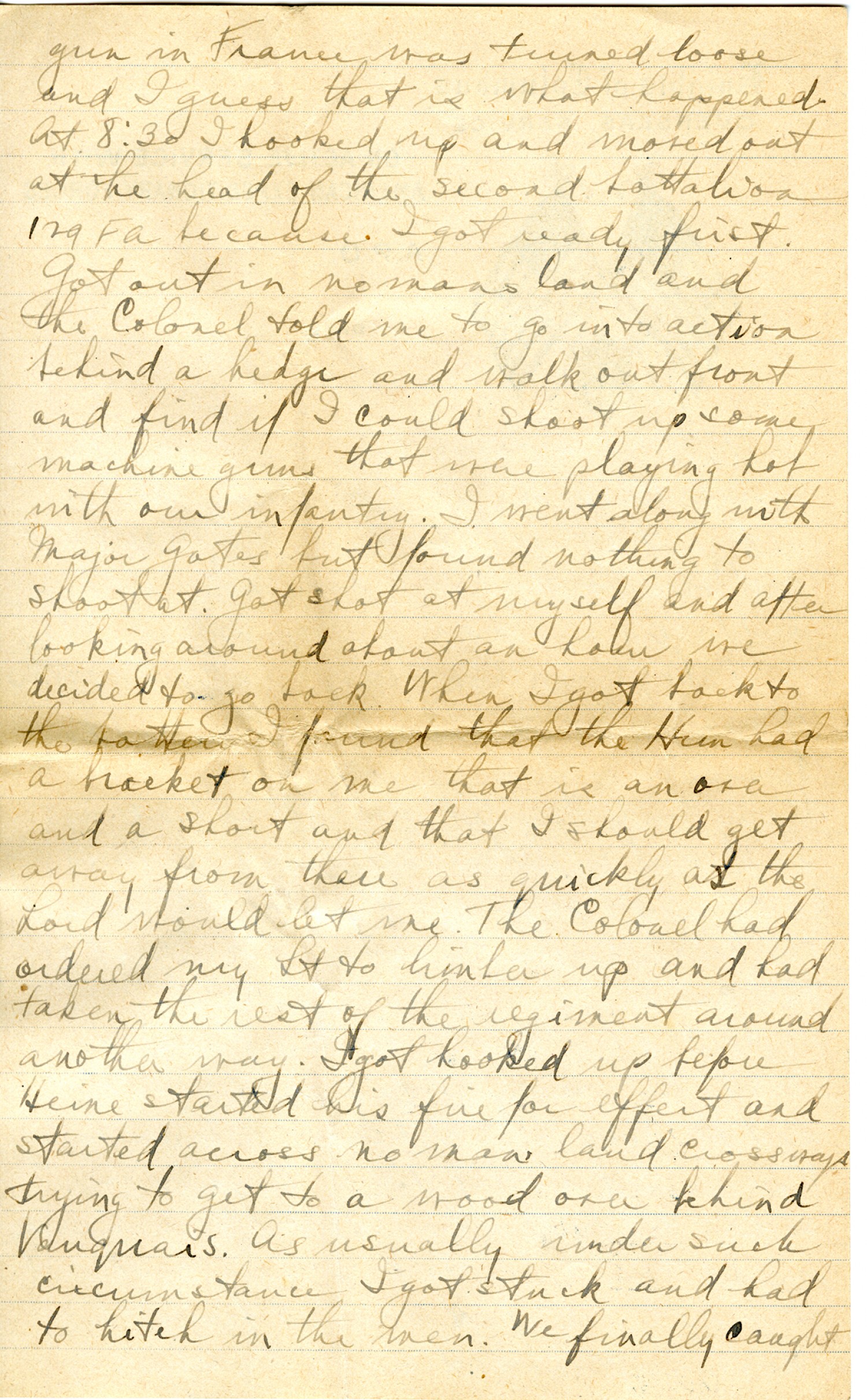 gun in France was turned loose and I guess that is what happened. At 8:30 I hooked up and moved out at the head of the second battalion 129 FA because I got ready first. Got out in no man's land and the Colonel told me to go into action behind a hedge and walk out front and find if I could shoot up some machine guns that were playing hot with our infantry. I went along with Major Gates but I found nothing to shoot at. Got shot at myself and after looking around about an hour we decided to go back. When I got back to the battery I found that the Hun had a bracket on me that is an over and a short and that I should get away from there as quickly as the Lord would let me. The Colonel had ordered my Lt to limber up and had taken the rest of the regiment around another way. I got hooked up before Heine started his fire for effect and started across no mans land crossways trying to get to a wood over behind Vauquois. As usually under such circumstance I got stuck and had to hitch in the men. We finally caught