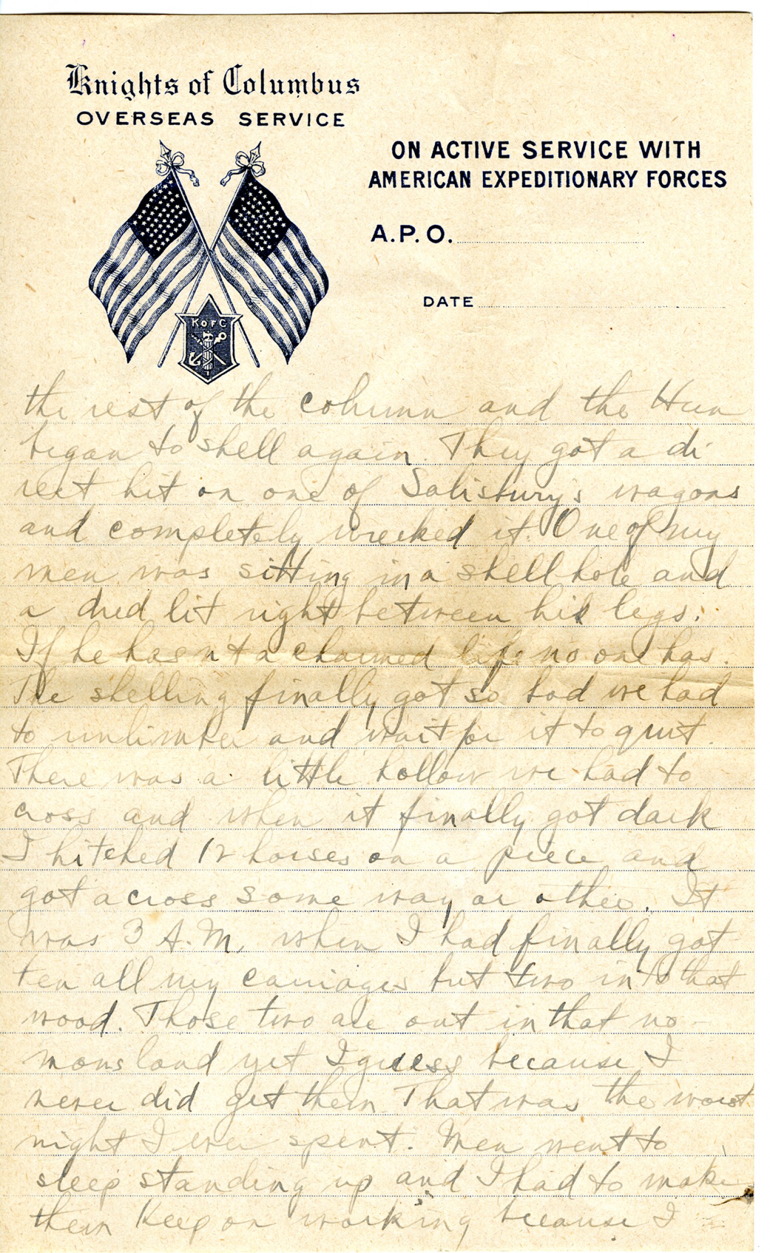 [Knights of Columbus letterhead] the rest of the column and the Hun began to shell again. They got a direct hit on one of Salisbury's wagons and completely wrecked it. One of my men was sitting in a shell hole and a dud lit right between his legs. If he hasn't a charmed life no one has. The shelling finally got so bad we had to unlimber and wait for it to quit. There was a little hollow we had to cross and when it finally got dark I hitched 12 horses on a piece and got across some way or other. It was 3 A.M. when I had finally gotten all my carriages but two into that wood. Those two are out in that no man's land yet I guess because I never did get them. That was the worst night I ever spent. Men went to sleep standing up and I had to make them keep on working because I