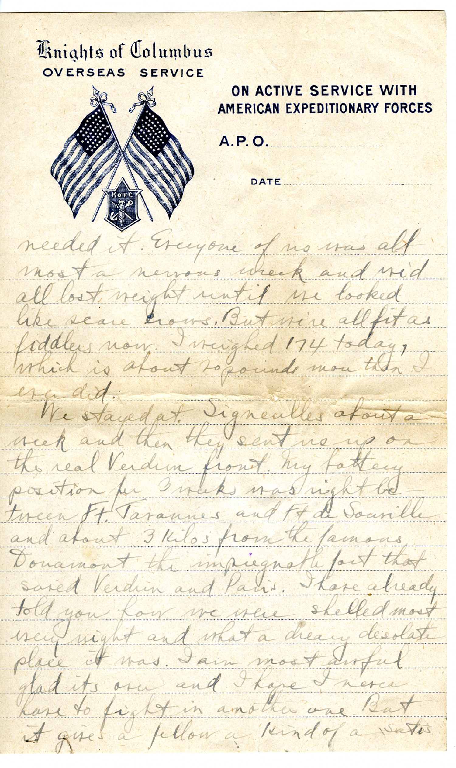 [Knights of Columbus letterhead] needed it. Every one of us was all most a nervous wreck and we'd lost weight until we looked like scare crows. But we're all fit as fiddles now. I weighed 174 today, which is about 20 pounds more than I ever did.We stayed at Signeulles about a week and then they went us up on the real Verdun front. My battery position for 3 weeks was right between Ft. Tavannes and Ft. de Souville and about 3 kilos from the famous Douamont the impregnable fort that saved Verdun and Paris. I have already told you how we were shelled most every night and what a dreary desolate place it was. I am most awful glad it's over and I hope I never have to fight in another one. But it gives a fellow a kind of a satis