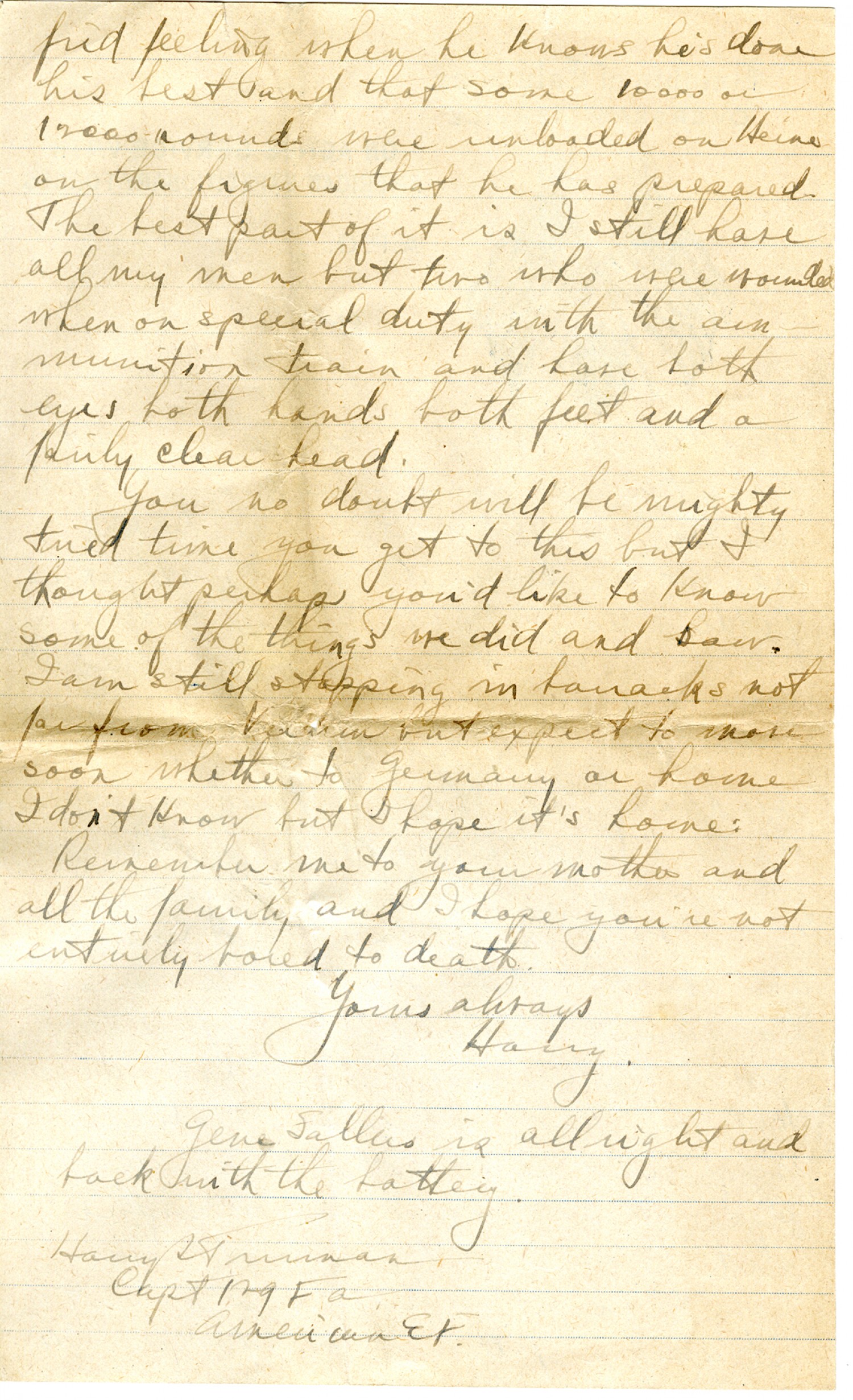 fied feeling when he knows he's done his best and that some 10,000 or 12,000 rounds were unloaded on Heine on the figures that he has prepared. The best part of it is I still have all my men but two who were wounded when on special duty with the ammunition train and have both eyes both hands both feet and a fairly clear head. You no doubt will be mighty tired time you get to this but I thought perhaps you'd like to know some of the things we did and saw. I am still stopping in barracks not far from Verdun but expect to move soon whether to Germany or home I don't know but I hope it's home. Remember me to your mother and all the family and I hope you're not entirely bored to death. Yours always Harry Gene Sallers is all right and back with the battery.Harry S. Truman Capt 129 F.A. American E. F.