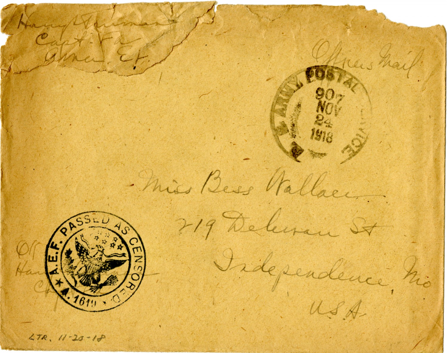 Harry S Truman Capt. FA Amer. E.F. Officers mail [stamp] Army Postal Service 907 [November] 24 1918 Miss Bess Wallace 219 Delaware St Independence,[Missouri] U.S.A. [stamp] Passed As Censored A. 1619 OK Harry S Truman Capt FA LTR 11-20-[1918]