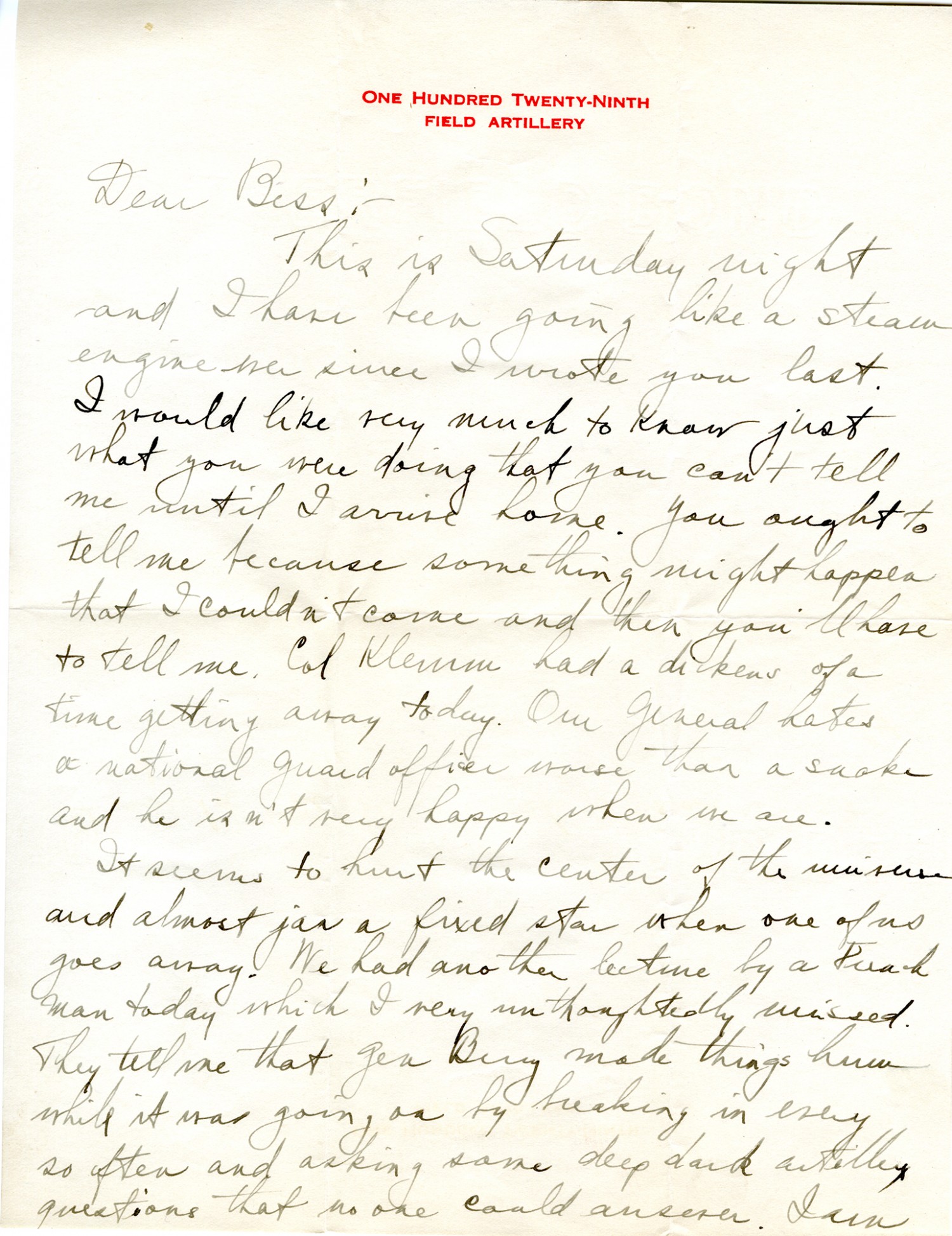 Lawton, [Oklahoma November] 7, 1917 Dear Bess: This is Saturday night and I have been going like a steam engine ever since I wrote you last. I would like very much to know just what you were doing that you can't tell me until I arrive home. You ought to tell me because something might happen that I couldn't come and then you'll have to tell me. Col Klemm had a dickens of a time getting away today. Our General hates a national guard officer worse than a snake and he isn't very happy when we are. It seems to hurt the center of the universe and almost jar a fixed star when one of us goes away. We had another lecture by a [ms illegible 1 wd] man today which I very unthoughtedly missed. They tell me that Gen Berry made things hum while it was going on by breaking in every so often and asking some deep dark artillery questions that no one could answer. I am