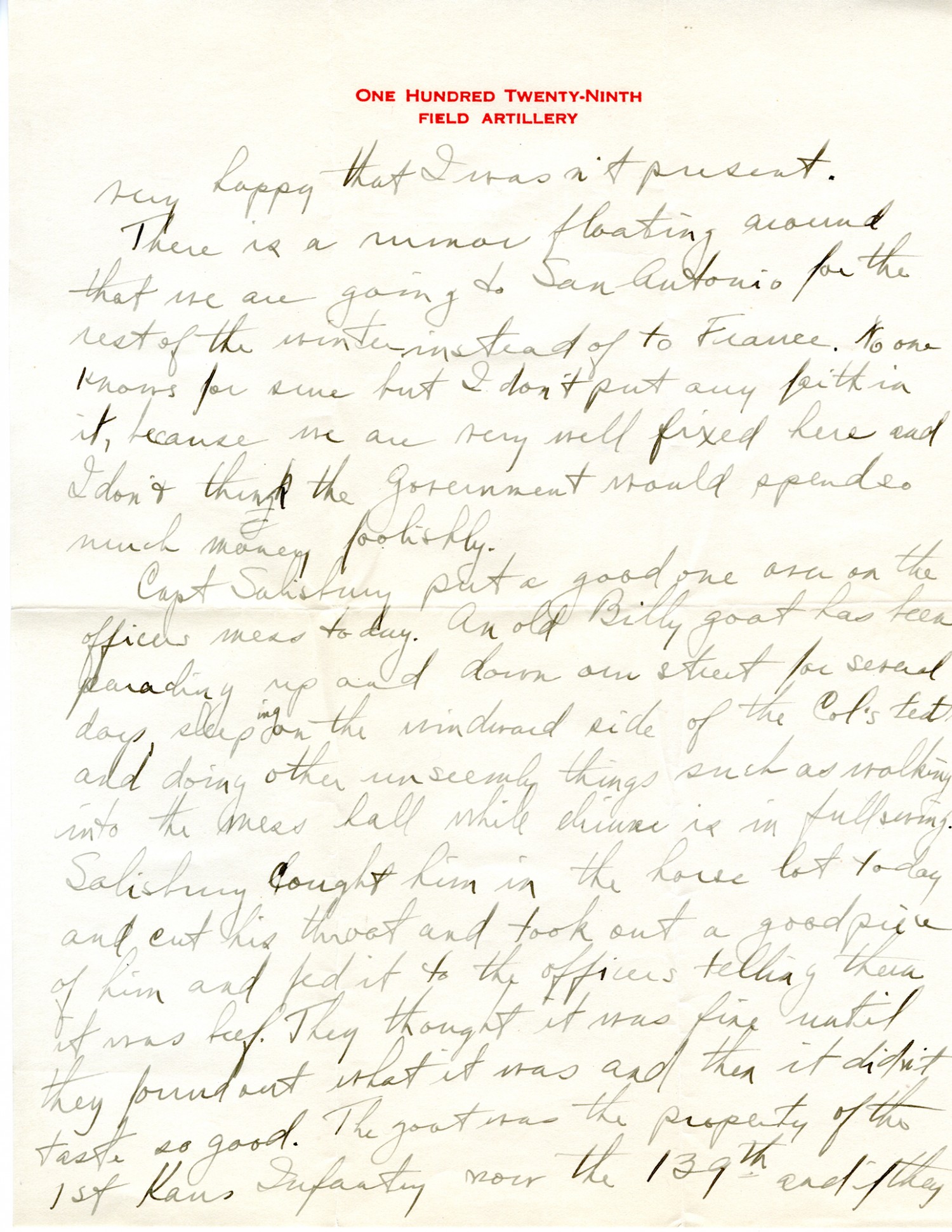 very happy that I wasn't present. There is a rumor floating around that we are going to San Antonio for the rest of the winter instead of to France. No one knows for sure but I don't put any faith in it because we are very well fixed here and I don't think the Government would spend so much money foolishly. Captain Salisbury put a good one over on the officers yesterday. An old Billy goat has been parading up and down our street for several days, sleeping on the windward side of the Col’s tent and doing other unseemly things such as walking into the mess hall while dinner is in full swing. Salisbury caught him in the horse lot today and cut his throat and took out a good piece of him and fed it to the officers telling them it was beef. They thought it was fine until they found out what it was and then it didn't taste so good. The goat was the property of the 1st Kansas Infantry, now the 139th, and if they