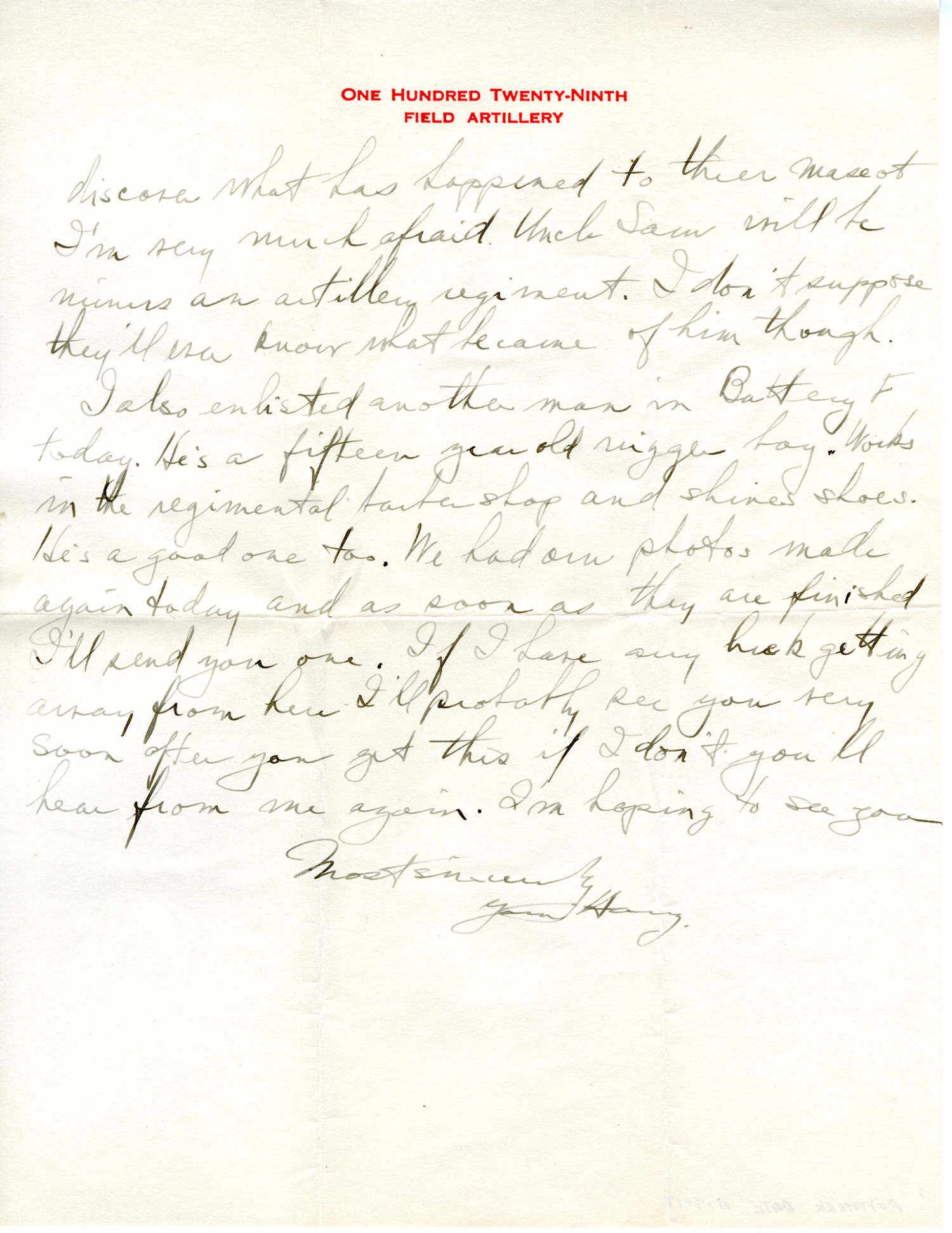 discover what has happened to their mascot I'm very much afraid Uncle Sam will be minus an artillery regiment. I don't suppose they'll ever know what became of him though. I also enlisted another man in Battery F today. He's a fifteen year-old nigger boy. Works in the regimental barber shop and shines shoes. He's a good one too. We had our photos made again today and as soon as they are finished I'll send you one. If I have any luck getting away from here I'll probably see you very soon after you get this if I don't you'll hear from me again. I'm hoping to see you Most sincerely Harry