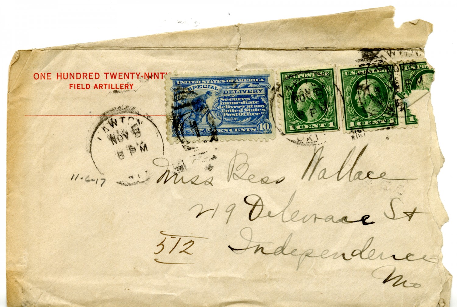 ONE HUNDRED TWENTY NINTH FIELD ARTILLERY 11-6-[1917][ms illegible: stamp] Miss Bess Wallace 219 Delaware St Independence [Missouri]512