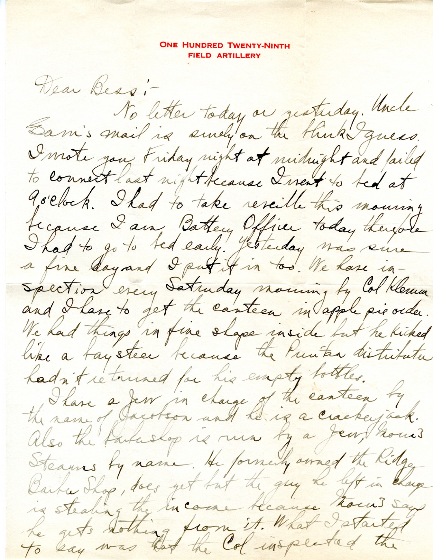 [One Hundred Twenty-Ninth Field Artillery letterhead]Lawton, [Oklahoma October] 28, 1917 Dear Bess: No letter today or yesterday. Uncle Sam's mail is surely on the blink I guess. I wrote you Friday night at midnight and failed to connect last night because I went to bed at 9 o'clock. I had to take reveille this morning because I am Battery Officer today therefore I had to go to bed early. Yesterday was sure a fine day and I put it in too. We have inspection every Saturday morning by Colonel Klemm and I have to get the canteen in apple pie order. We had things in fine shape inside but he kicked like a bay steer because the Puritan distributor hadn't returned for his empty bottles. I have a Jew in charge of the canteen by the name of Jacobson and he is a cracker-jack. Also the barbershop is run by a Jew, Morris Stearns by name. He formerly owned the Ridge Barber Shop, does yet but the guy he left in charge is stealing the income because Morris says he gets nothing from it. What I started to say was that the Col inspected the