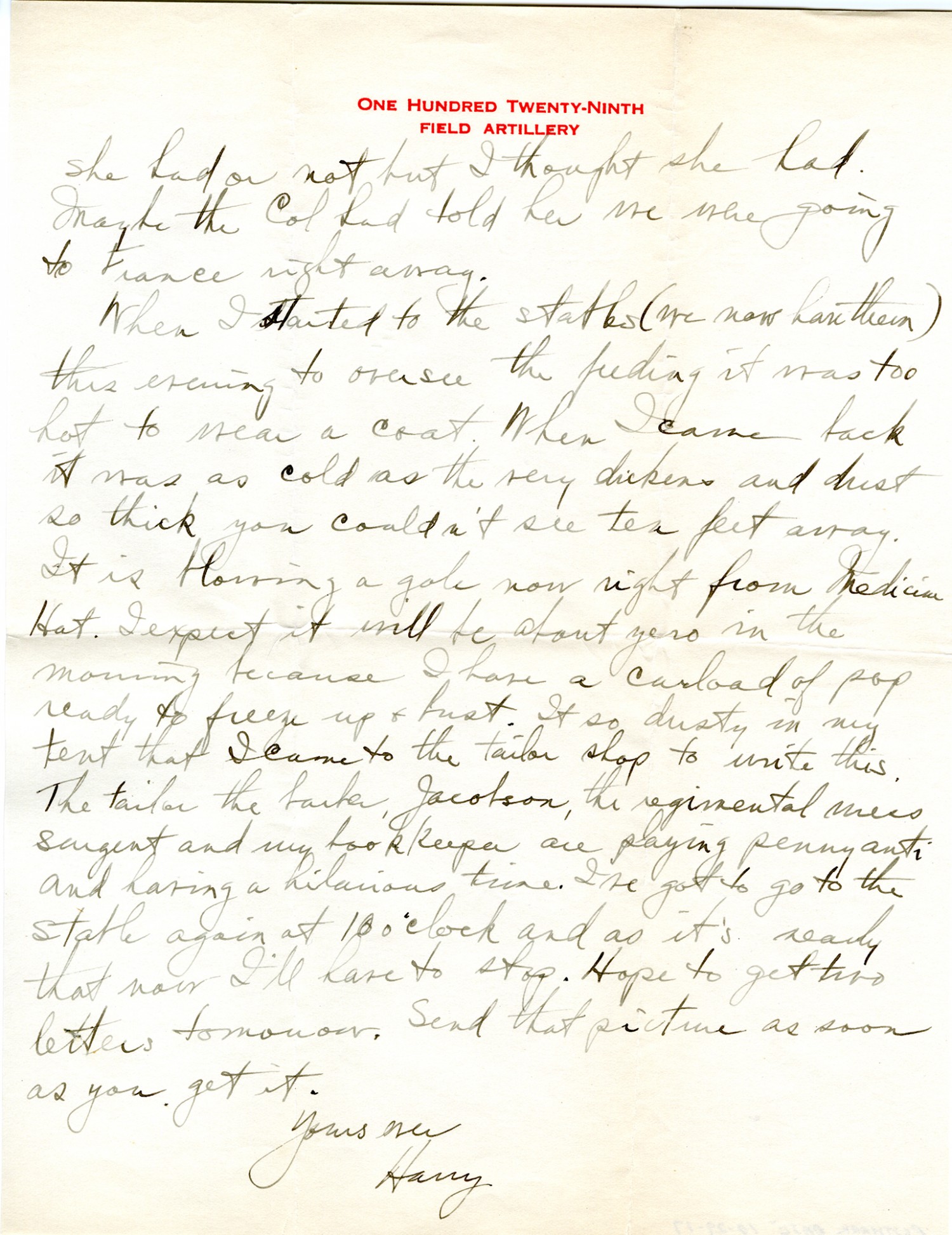 [One Hundred Twenty-Ninth Field Artillery letterhead]she had or not but I thought she had. Maybe the Col had told her we were going to France right away. When I started to the stables (we now have them) this evening to oversee the feeding it was too hot to wear a coat. When I came back it was as cold as the very dickens and dust so thick you couldn't see ten feet away. It is blowing a gale now right from Medicine Hat. I expect it will be about zero in the morning because I have a carload of pop ready to freeze up and bust. It so dusty in my tent that I came to the tailor shop to write this. The tailor the barber, Jacobson, the regimental mess sergeant and my bookkeeper are playing penny ante and having a hilarious time. I've got to go to the stable again at 10 o'clock and as it's nearly that now I'll have to stop. Hope to get two letters tomorrow. Send that picture as soon as you get it. Yours ever Harry