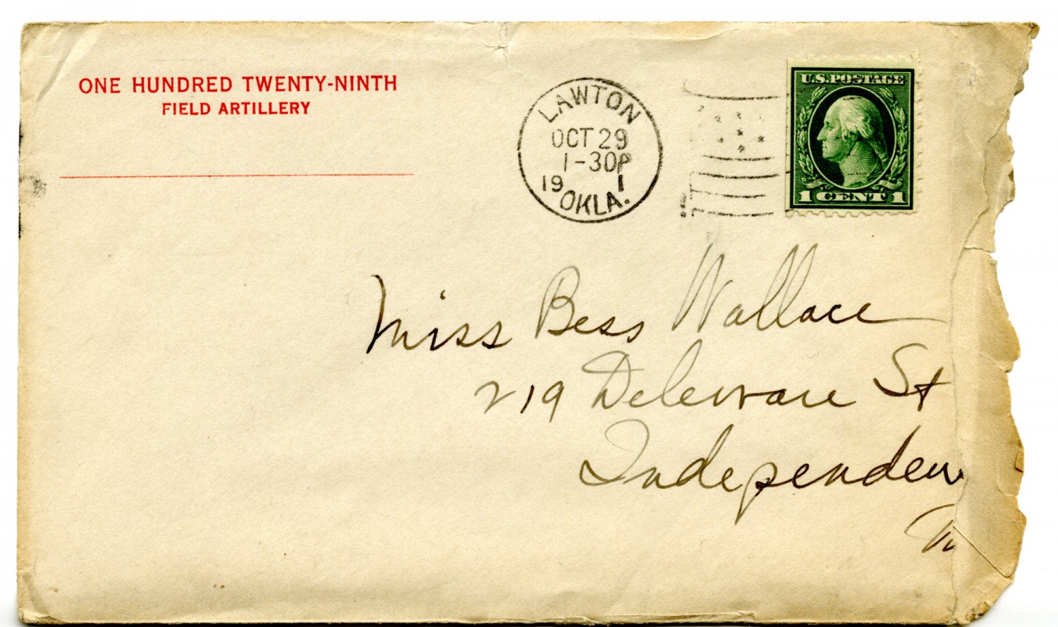 ONE HUNDRED TWENTY-NINTH FIELD ARTILLERY [stamp] LAWTON OKLA. OCT 29 1-30P 19 Miss Bess Wallace 219 Delaware St Independence [Missouri]