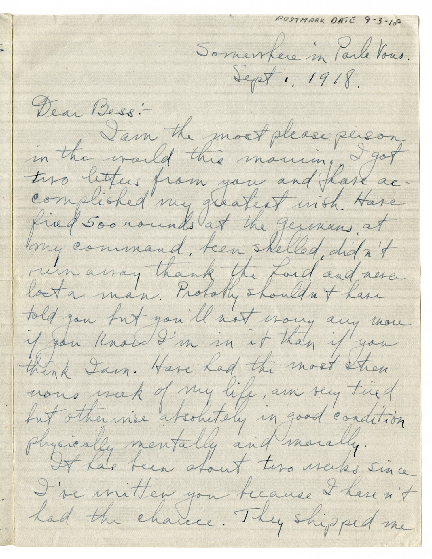 POSTMARK DATE 9-3-[1918] Somewhere in Parle-Vous September 1, 1918. Dear Bess: I am the most pleased person in the world this morning. I got two letters from you and have accomplished my greatest wish. Have fired 500 rounds at the Germans at my command, been shelled, didn't run away thank the Lord and never lost a man. Probably shouldn't have told you but you'll not worry any more if you know I'm in it than if you think I am. Have had the most strenuous week of my life, am very tired but otherwise absolutely in good condition physically mentally and morally. It has been about two weeks since I've written you because I haven't had the chance. They shipped me
