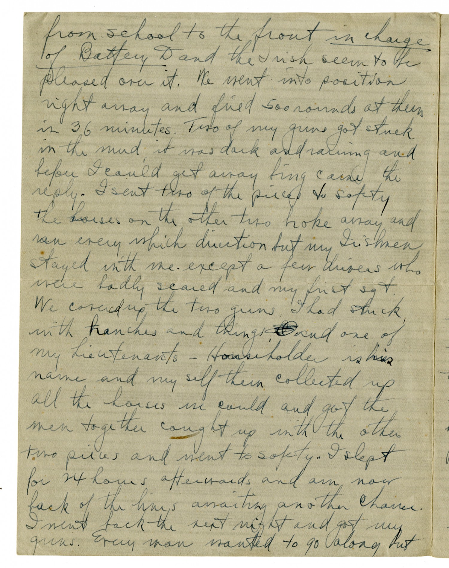 from school to the front in charge of Battery D and the Irish seem to be pleased over it. We went into position right away and fired 500 rounds at them in 36 minutes. Two of my guns got stuck in the mud, it was dark and raining and before I could get away bing came the reply. I sent two of the pieces to safety the horses on the other two broke away and ran every which direction but my Irishmen stayed with me, except a few drivers who were badly scared and my first sgt. We covered up the two guns I had stuck with branches and things, and one of my lieutenants—Housholder is his name and myself then collected up all the horses we could and got the men together caught up with the other two pieces and went to safety. I slept for 24 hours afterwards and am now back of the lines awaiting another chance. I went back the next night and got my guns. Every man wanted to go along but