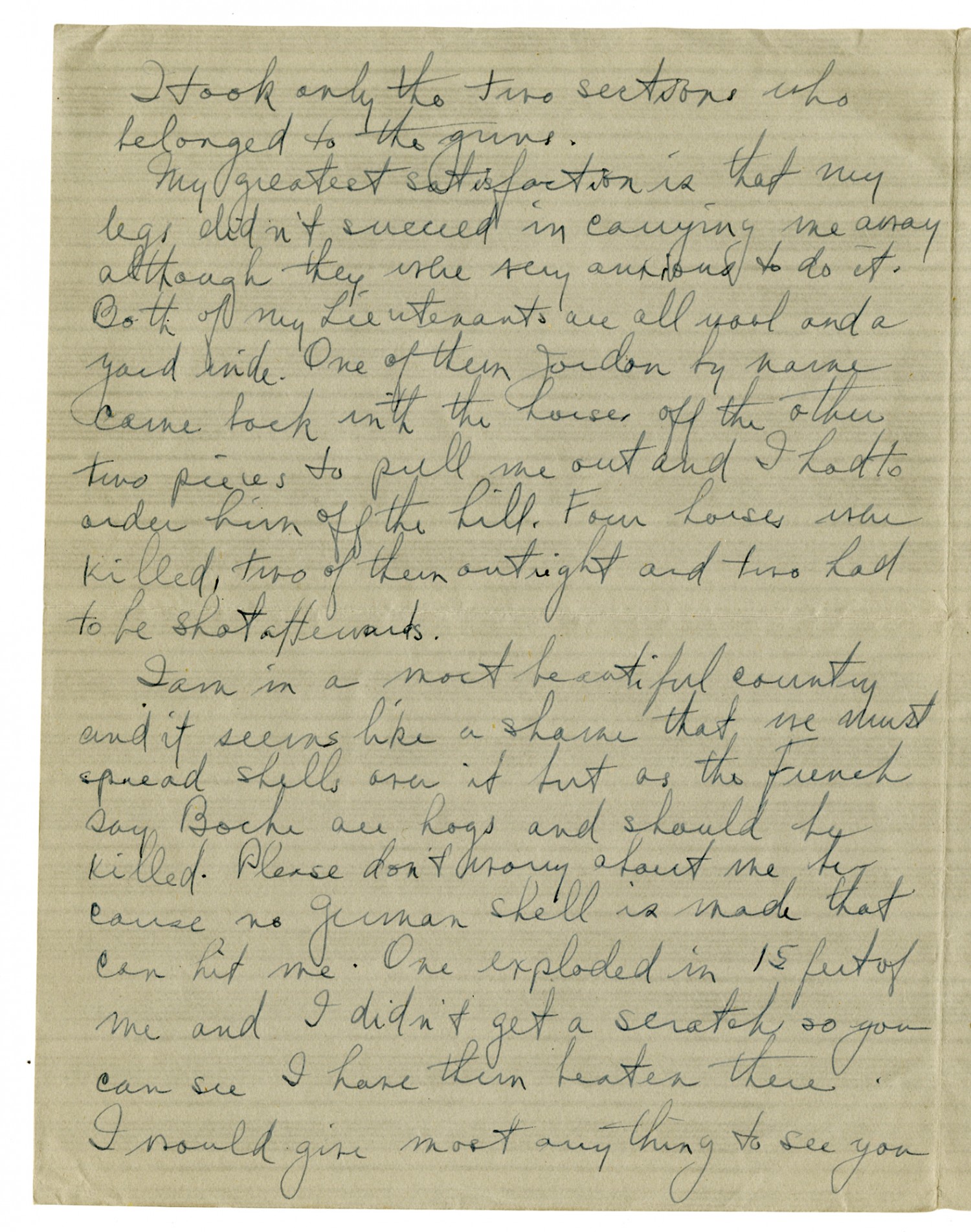 I took only the two sections who belonged to the guns. My greatest satisfaction is that my legs didn't succeed in carrying me away although they were very anxious to do it. Both of my lieutenants are all wool and a yard wide. One of them Jordon by name came back with the horses off the other two pieces to pull me out and I had to order him off the hill. Four horses were killed, two of them outright and two had to be shot afterwards. I am in a most beautiful country and it seems like a shame that we must spread shells over it but as the French say Boche are hogs and should be killed. Please don't worry about me because no German shell is made that can hit me. One exploded in 15 feet of me and I didn't get a scratch so you can see I have them beaten there. I would give most anything to see you